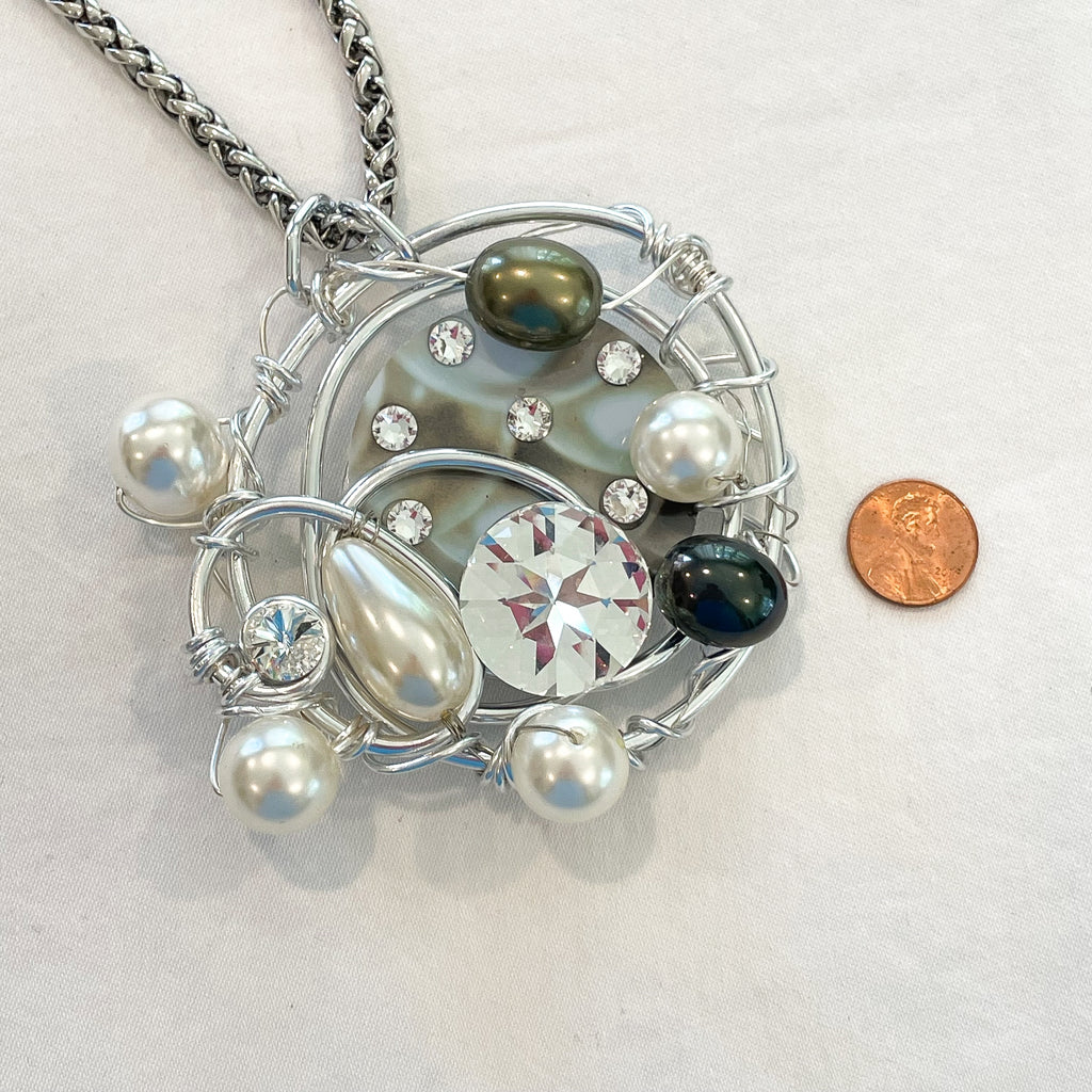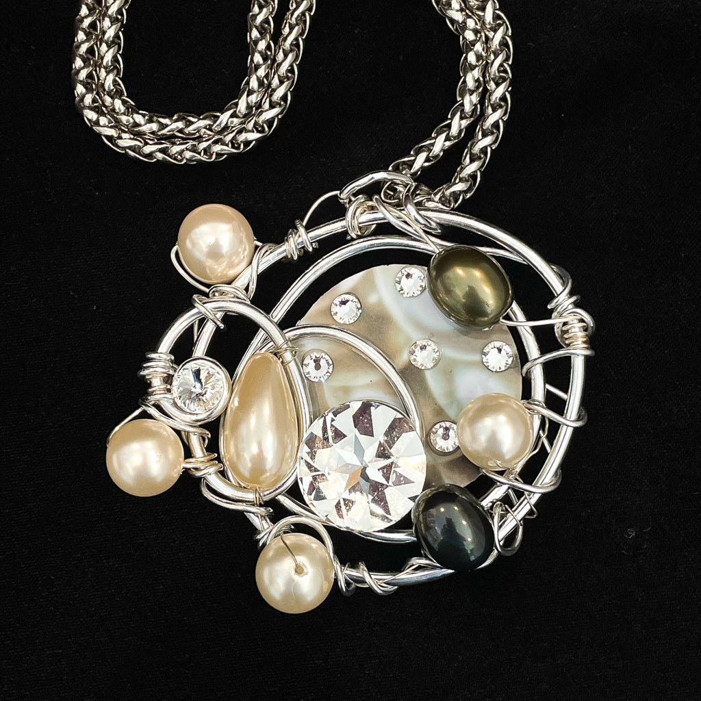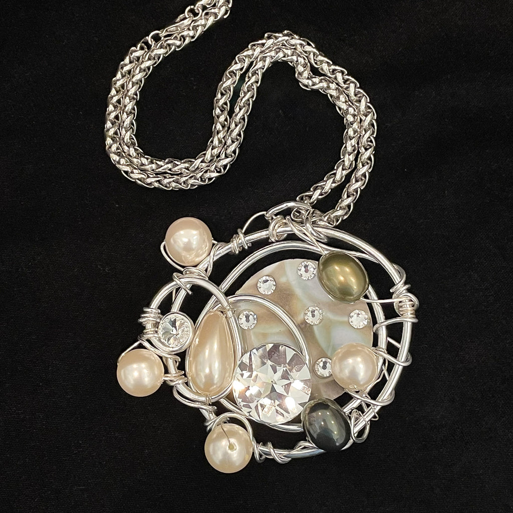 Materials: Swarovski crystals, faux pearls, faux MOP. Silver tone metal & chain.