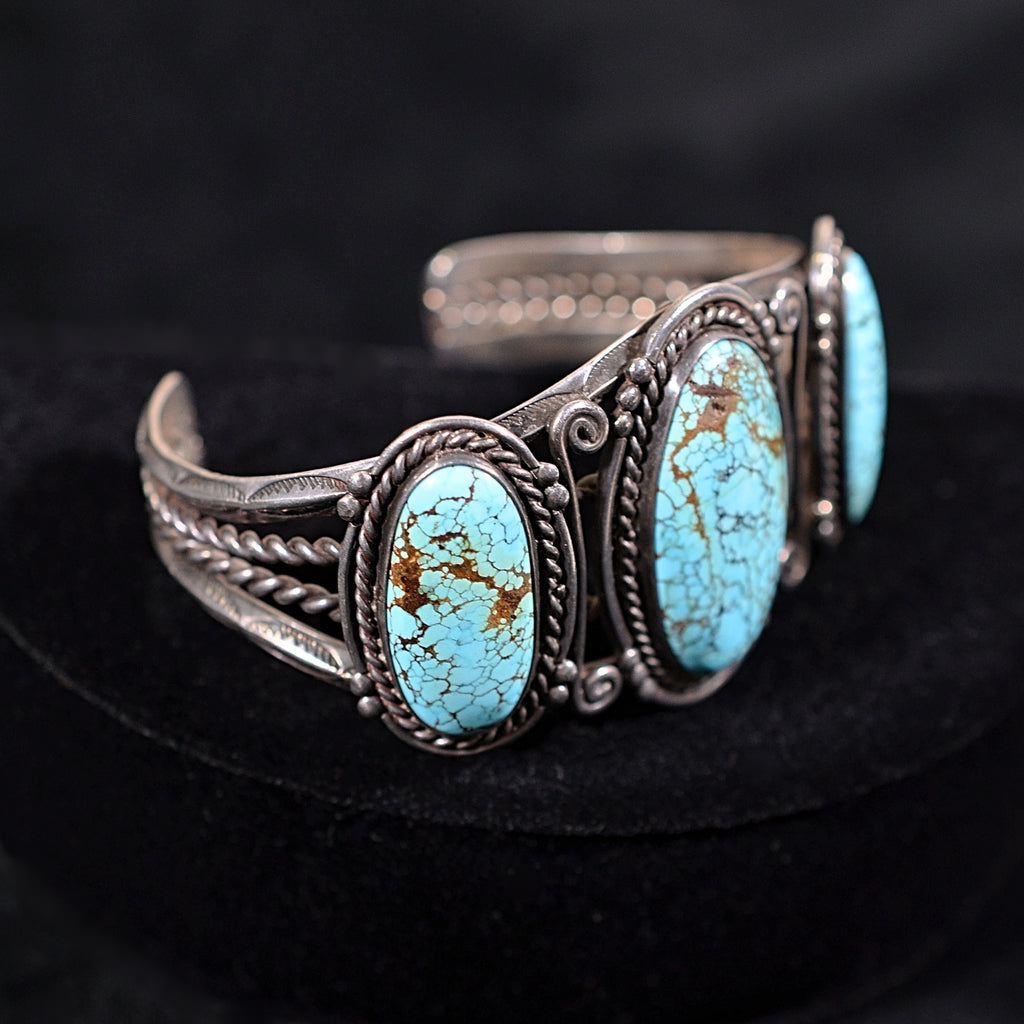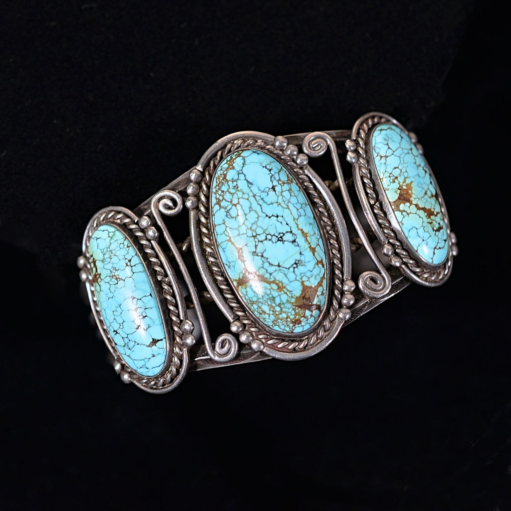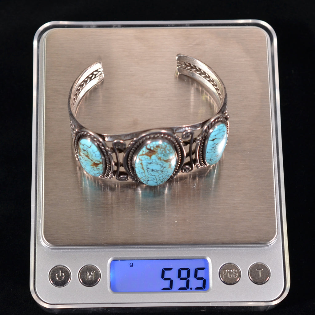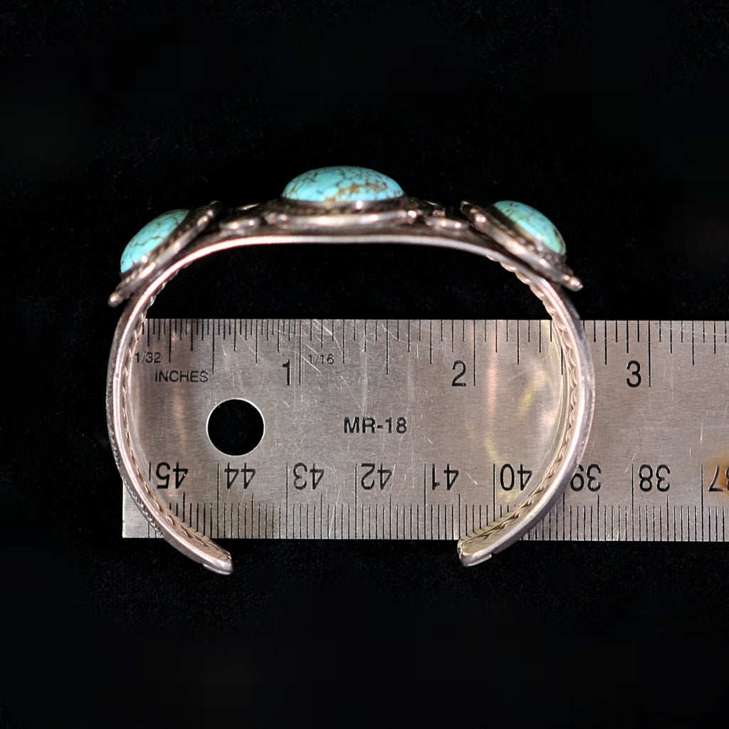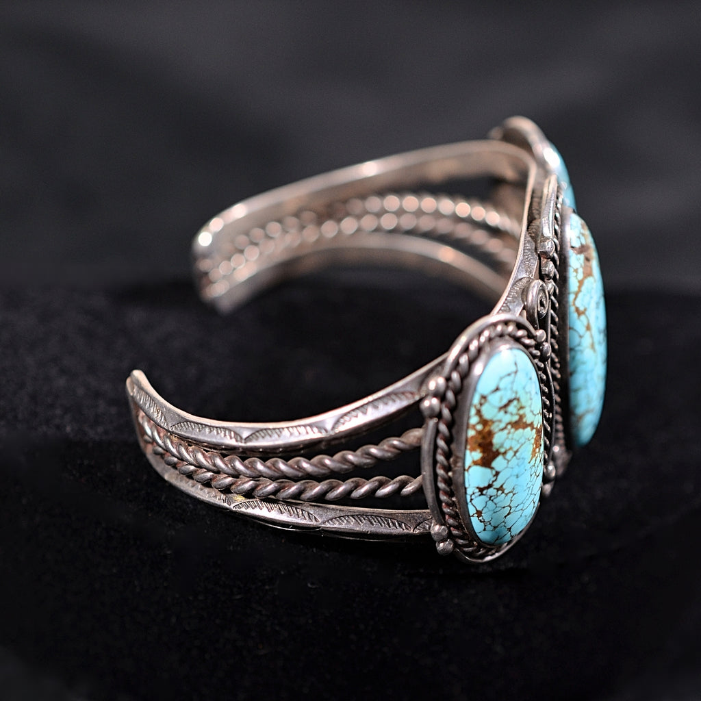 Vintage 1940s Native American cuff bracelet with 3 large oval #8 Turquoise stones.