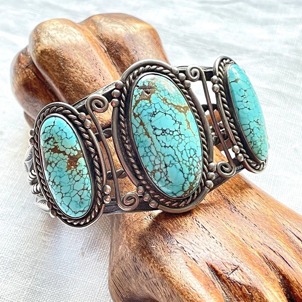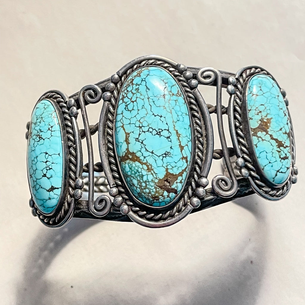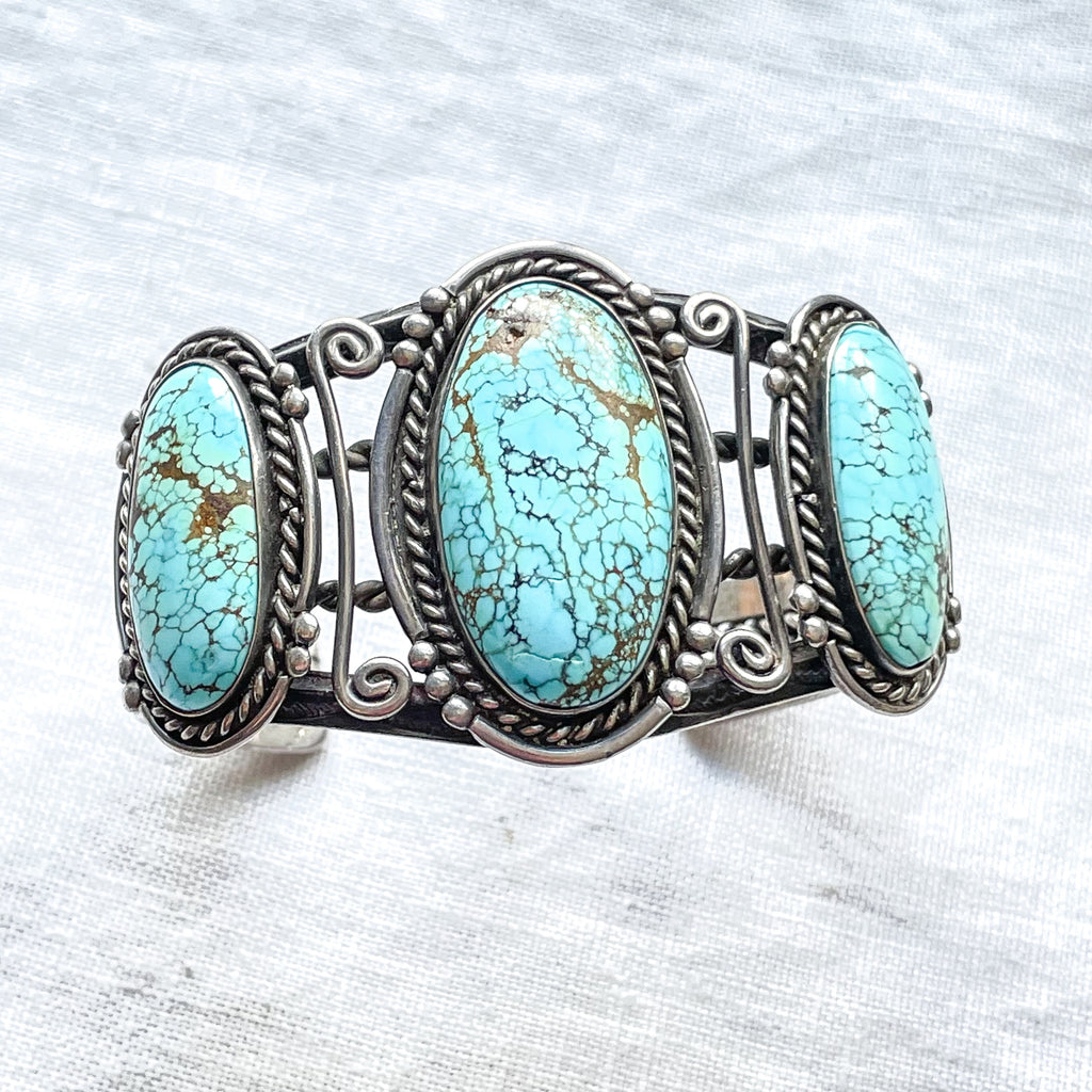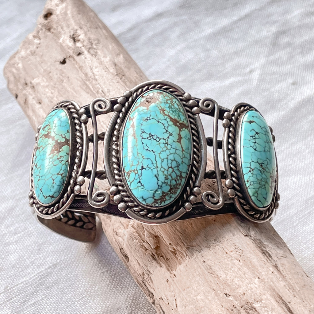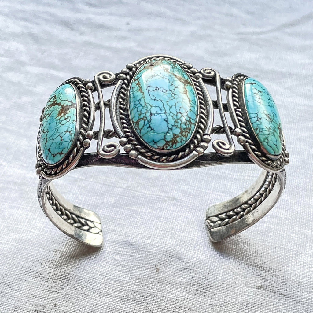 Vintage 1940s Native American cuff bracelet with 3 large oval #8 Turquoise stones.