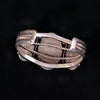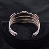 There is a swirl detail between the stones. The split shank bracelet has a rope detail on the center banding.
