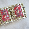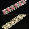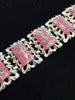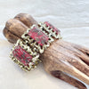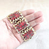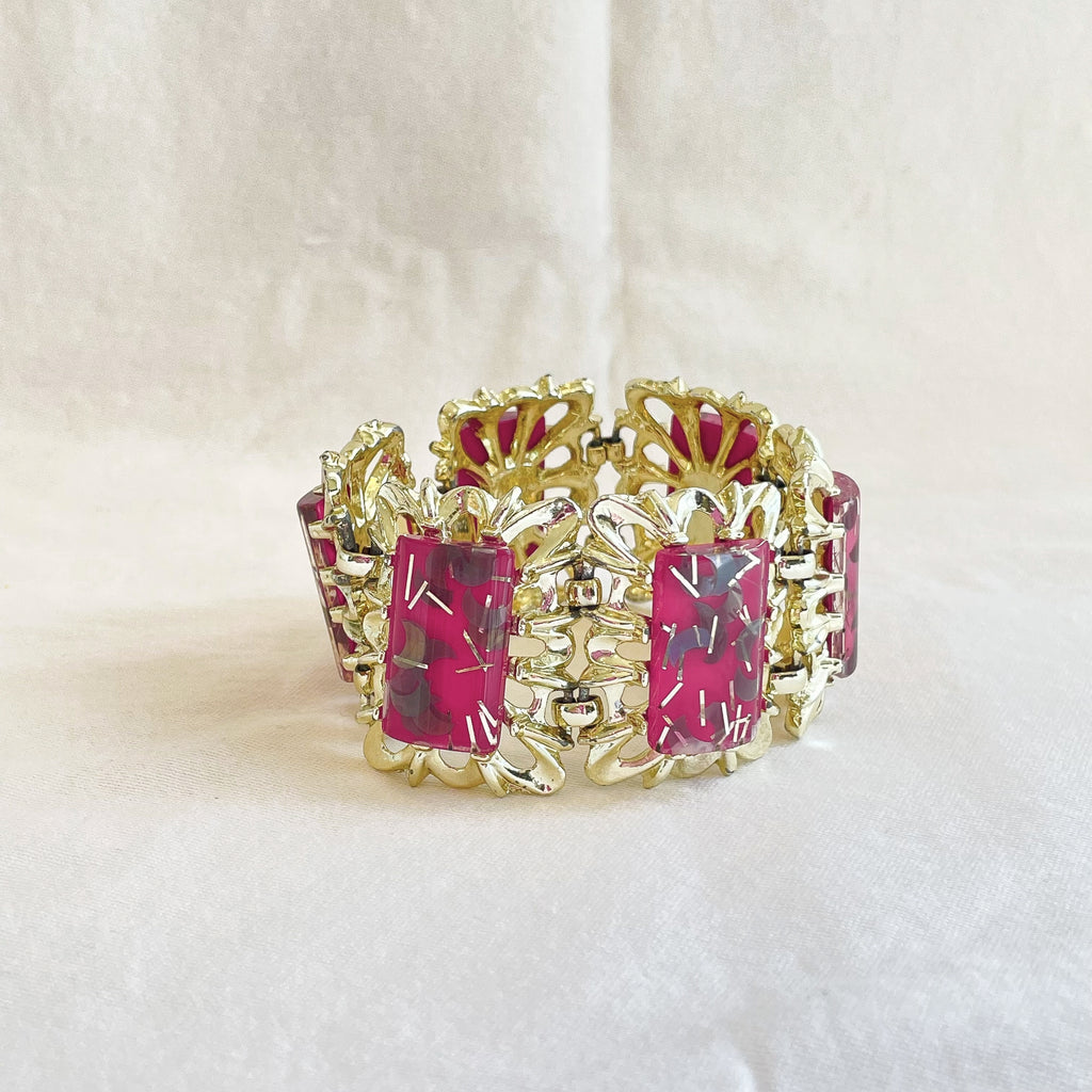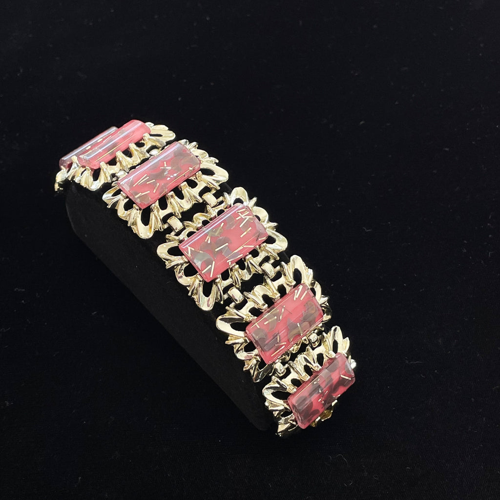 Lovely 6 panel bracelet, shiny light gold tone, watermelon pink & gold sparkle confetti stones.
