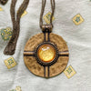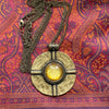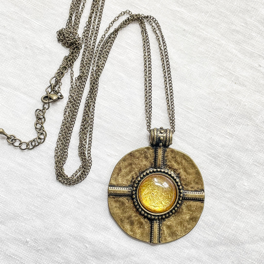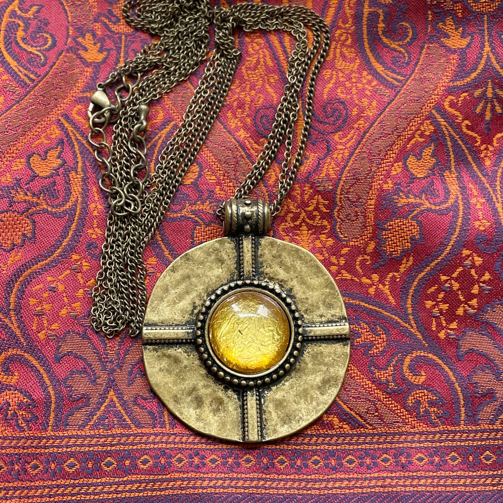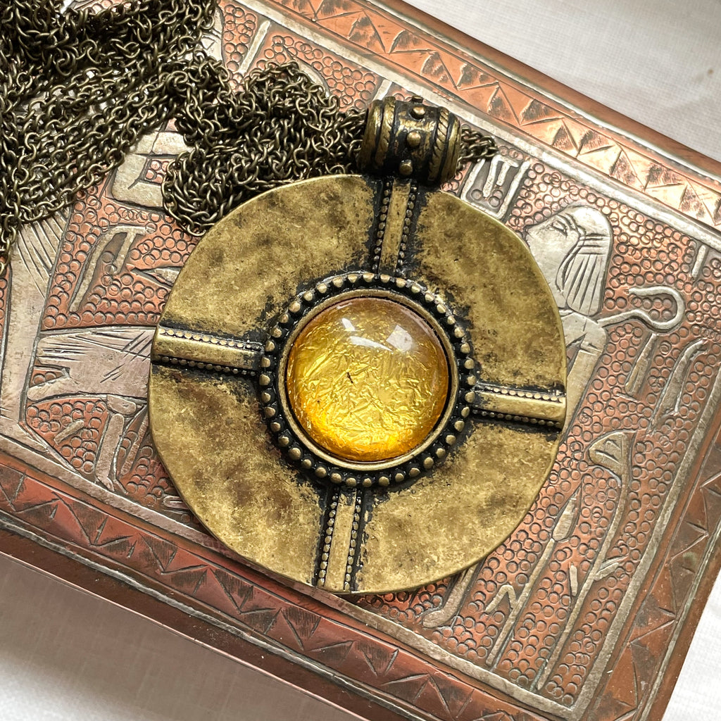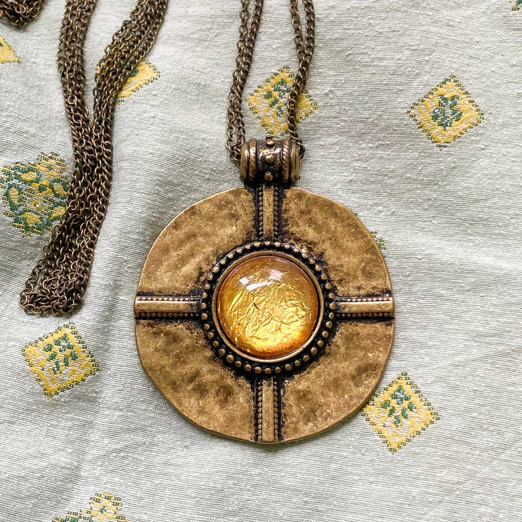 Vintage round bronze pendant with foil glass stone.