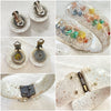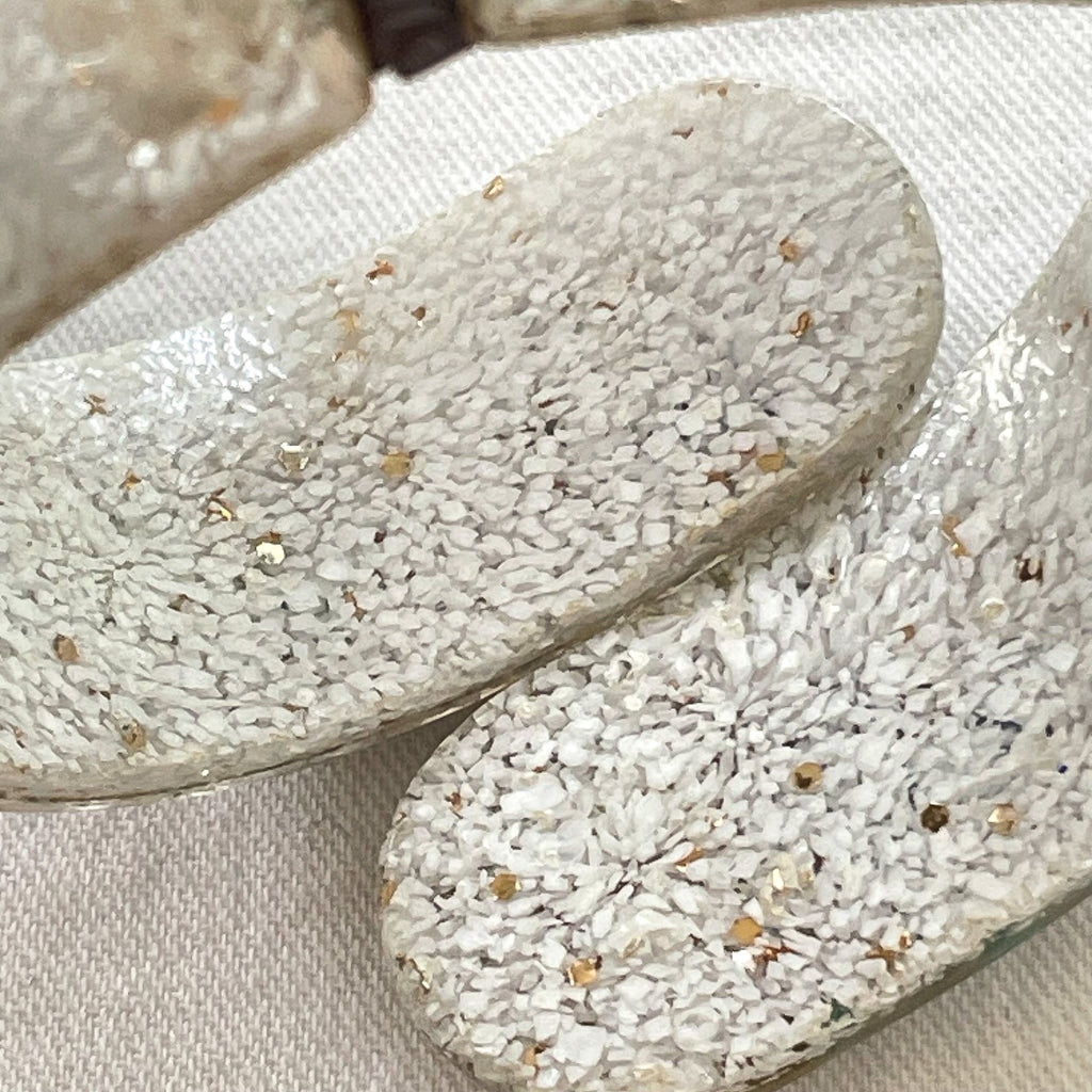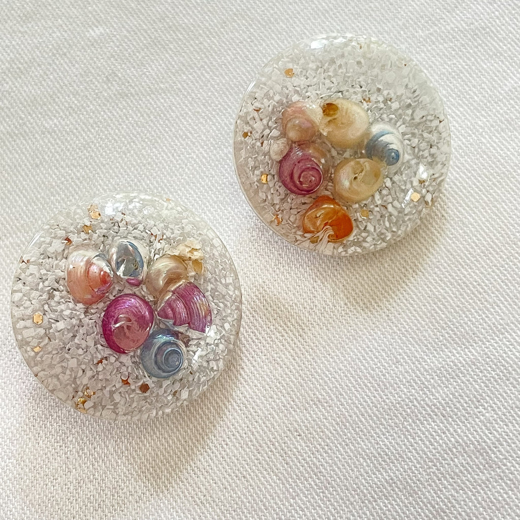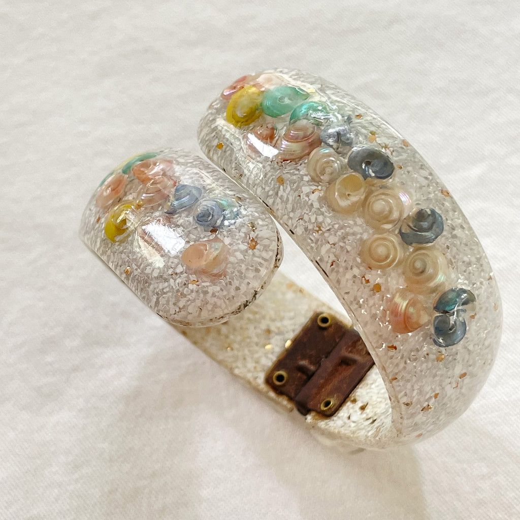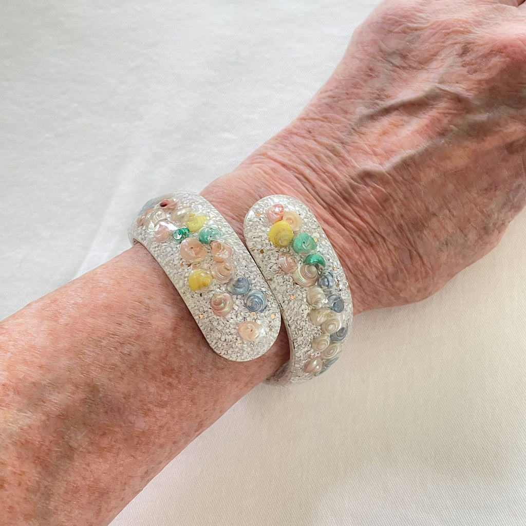 Clear Lucite & white confetti chip bracelet with pastel seashells and gold confetti.