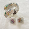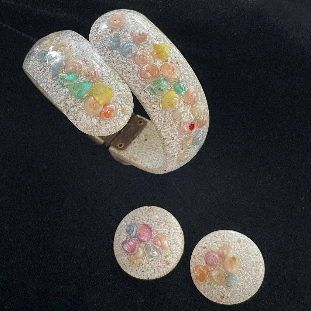 Vintage 60s confetti Lucite seashell clamper bracelet and earrings set.