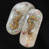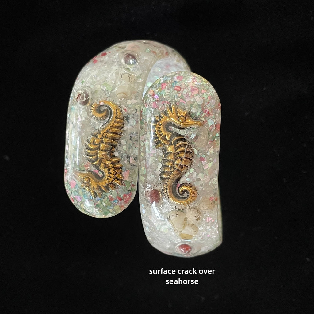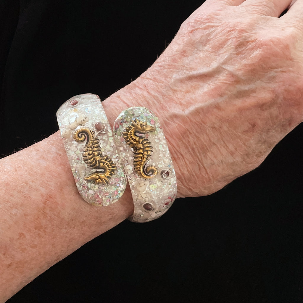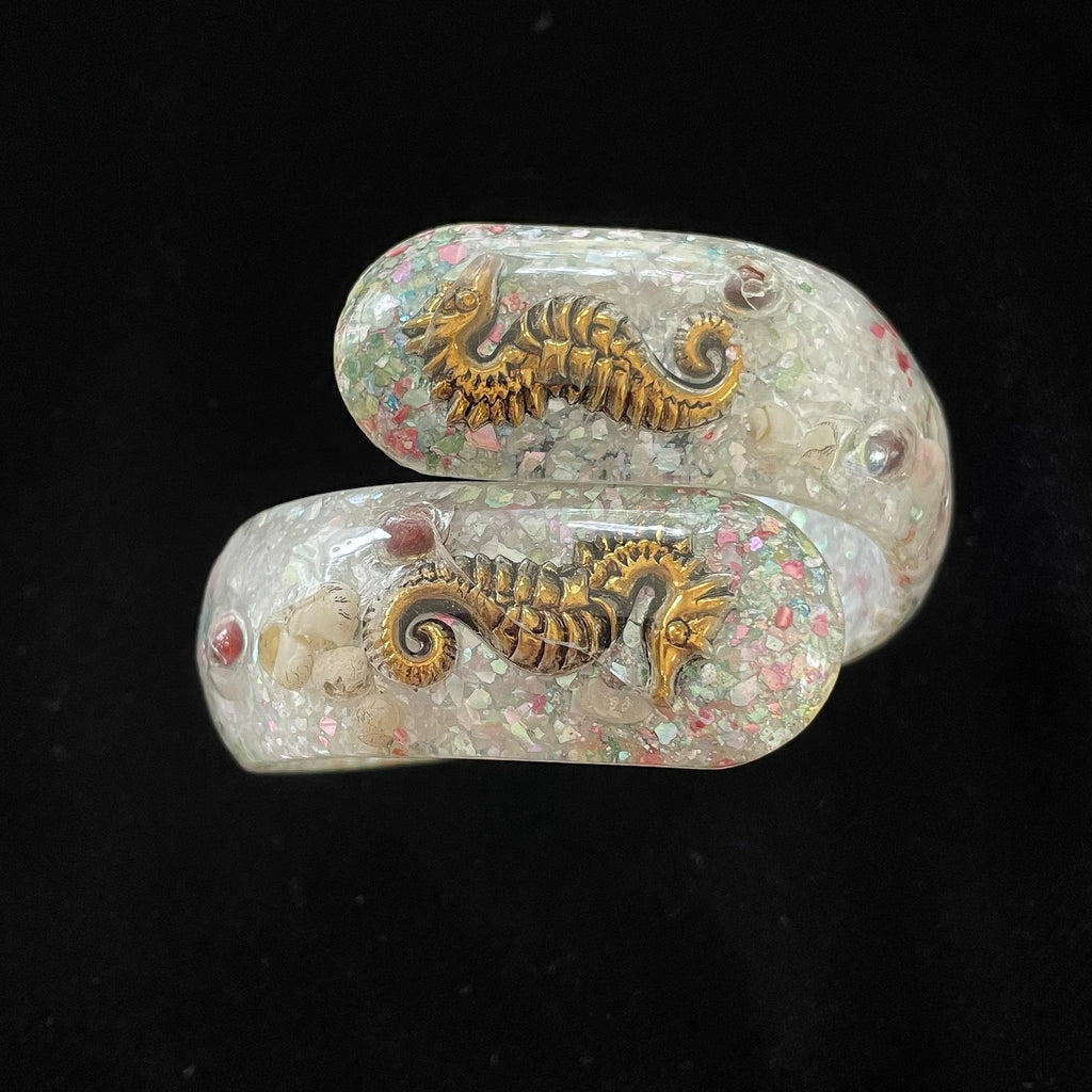 Clear Lucite, sparkle confetti, seashells and seahorses!