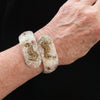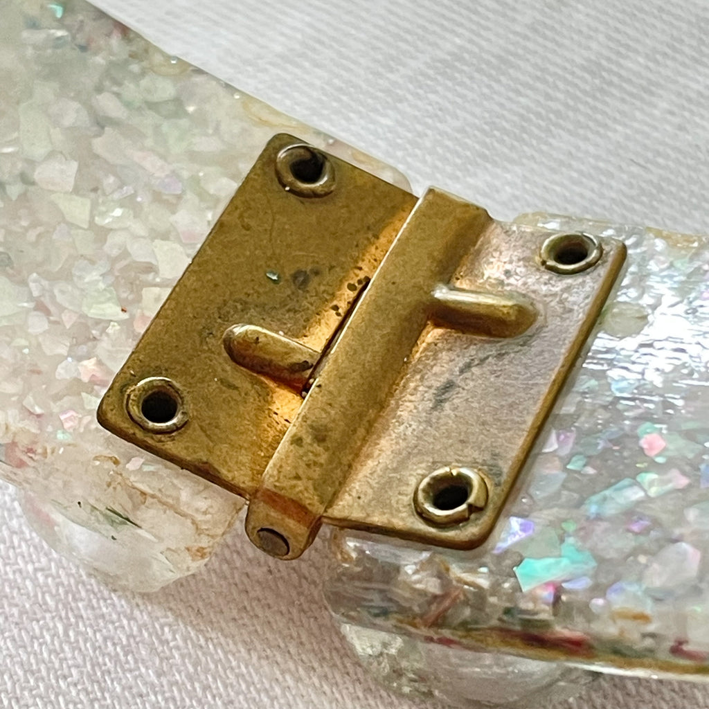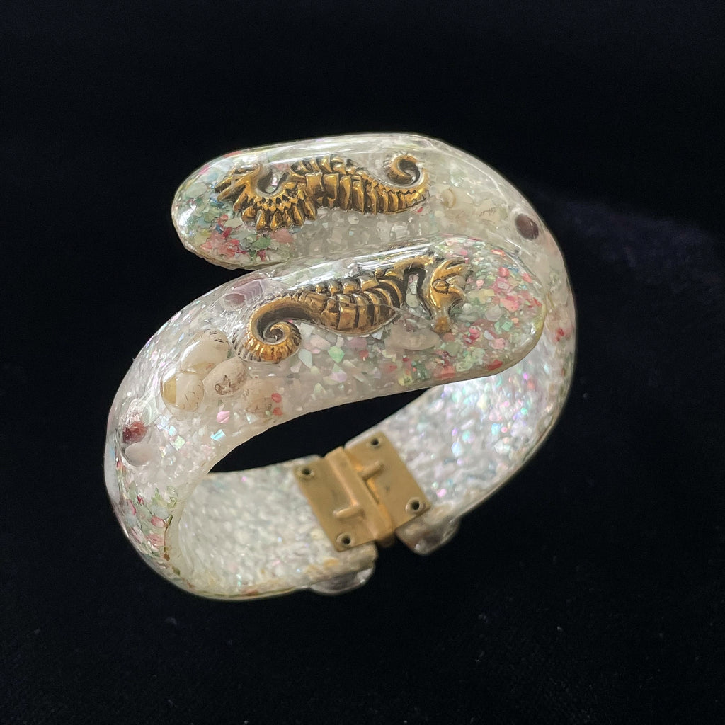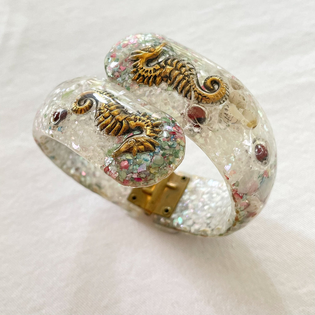 Vintage 60s confetti Lucite seahorse & seashell clamper bracelet.