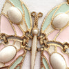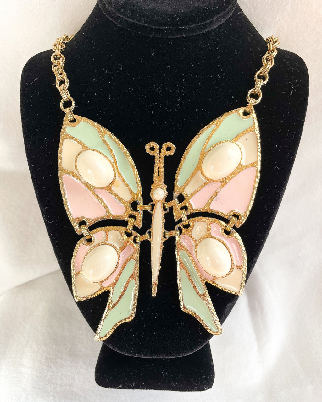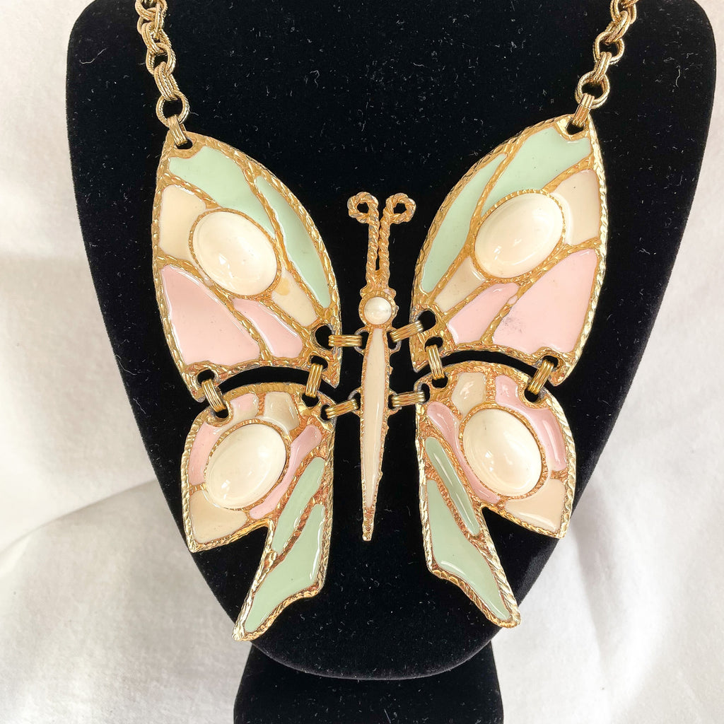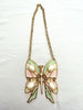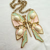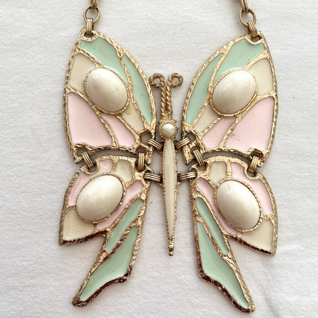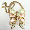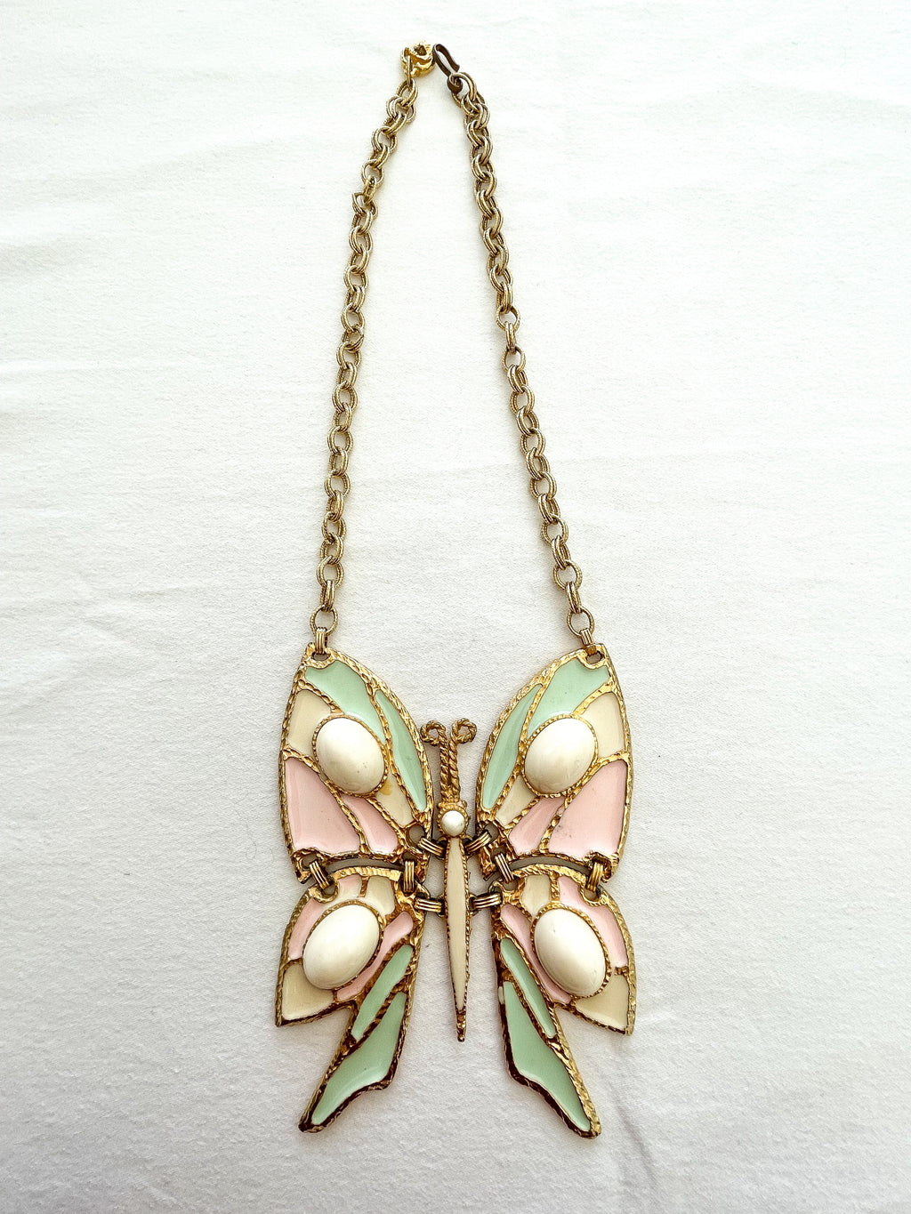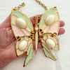 Vintage 70s large butterfly necklace pendant. Pastel enamel, large faux stones, gold tone metal.