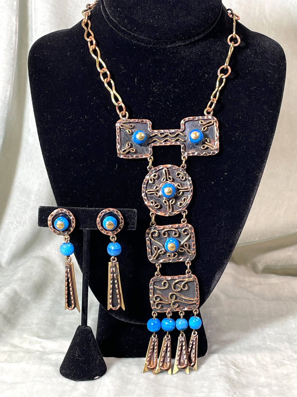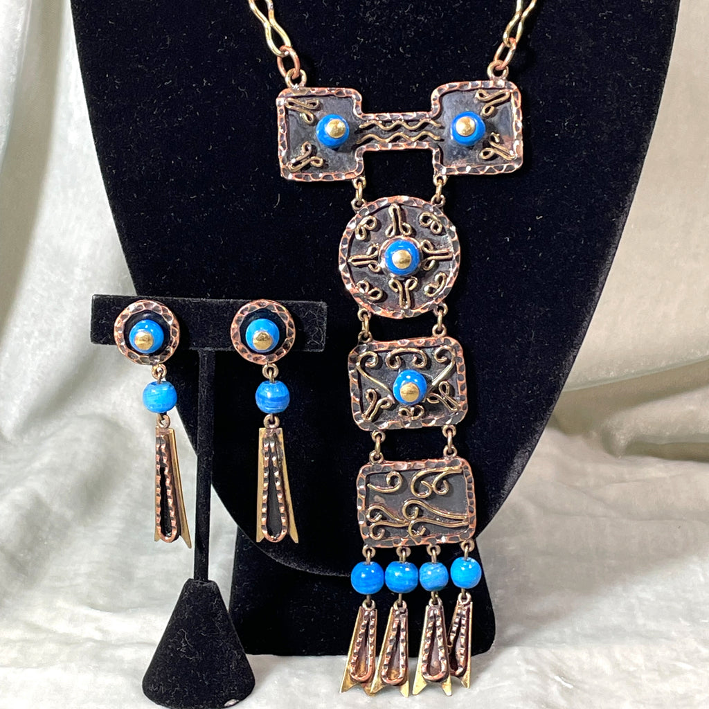 Vintage Casa Maya Aztec/Mayan style long segmented pendant necklace and a pair of earrings.