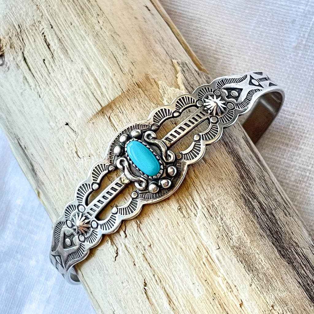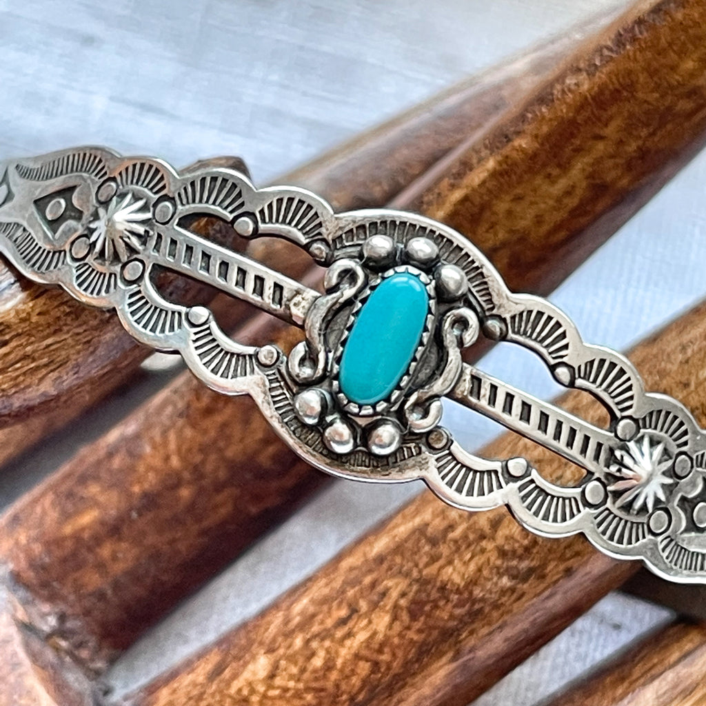 Bracelet is handmade, stamped with lovely Navajo design, small turquoise stone w/silver details surrounding.