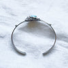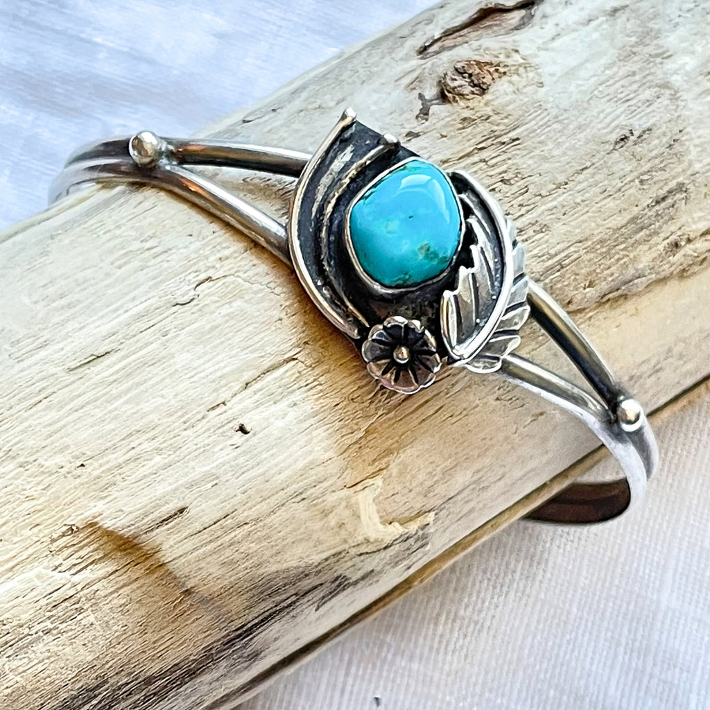 Bracelet is handmade, with swirls, leaf, flower and turquoise stone. Slim shank cuff.