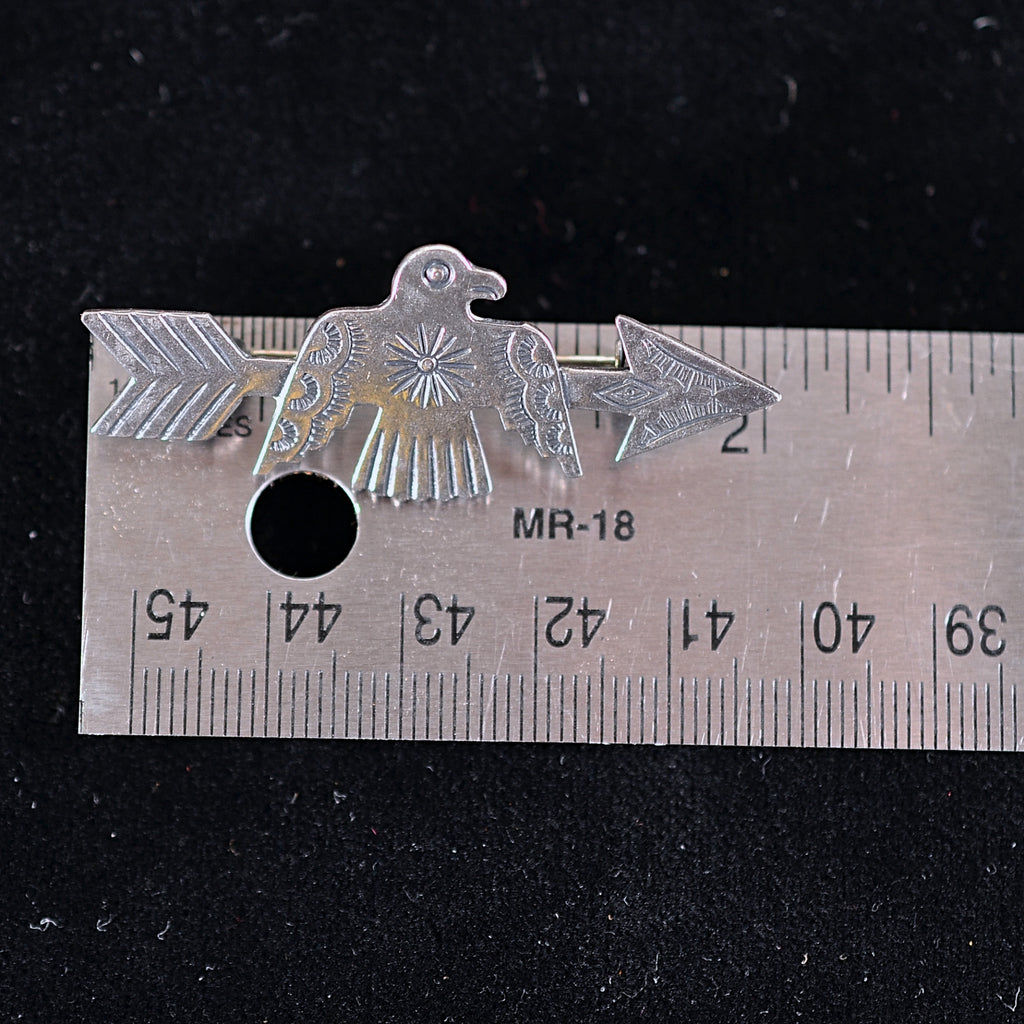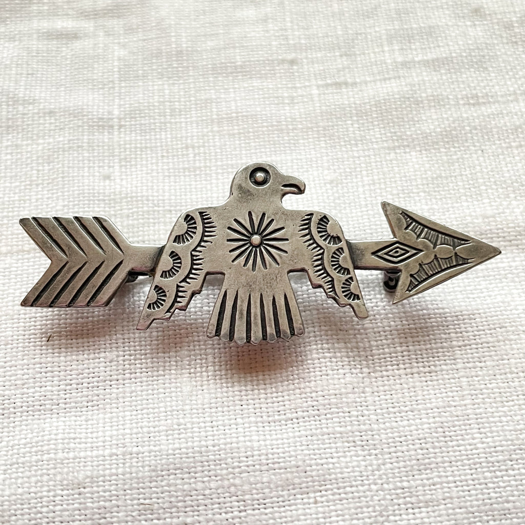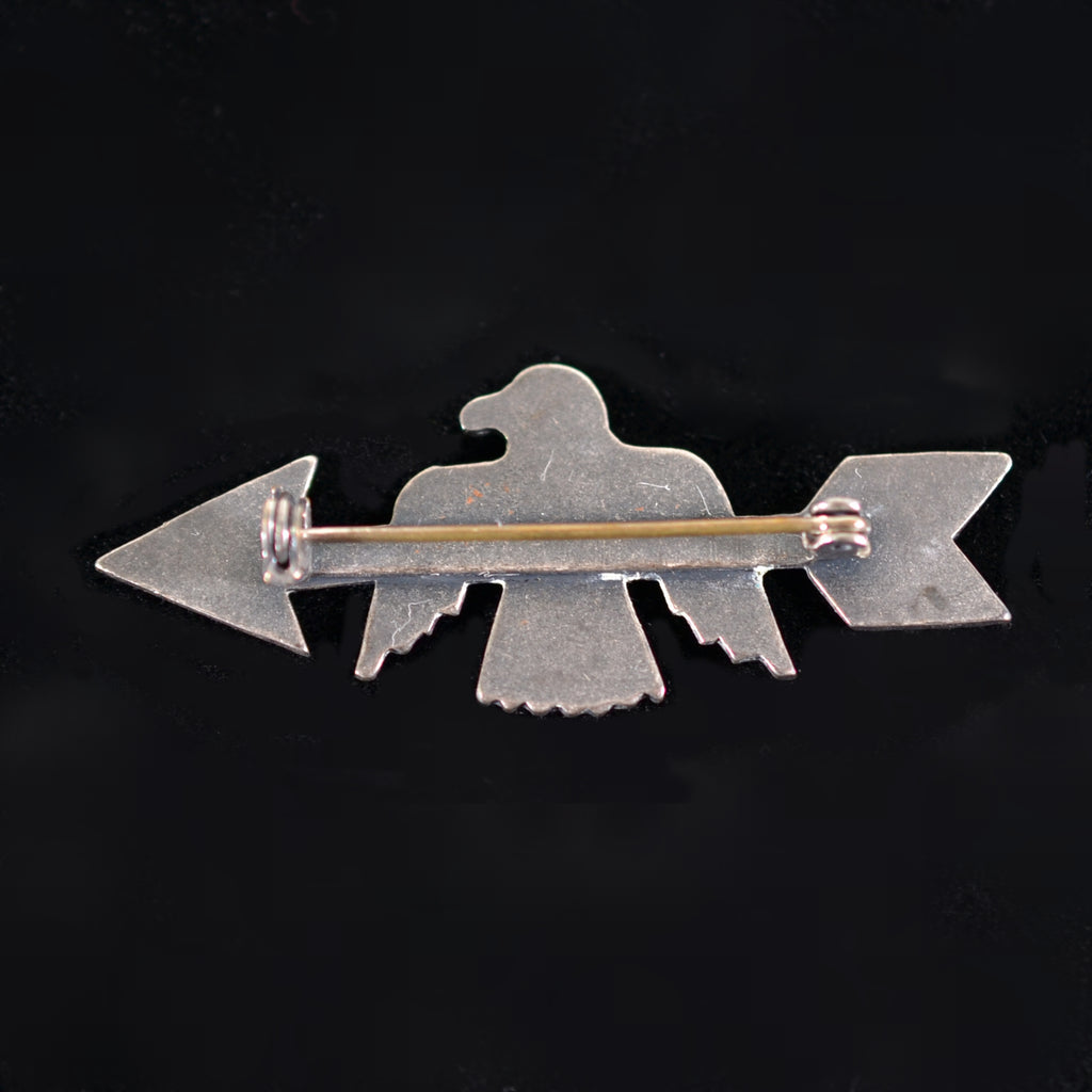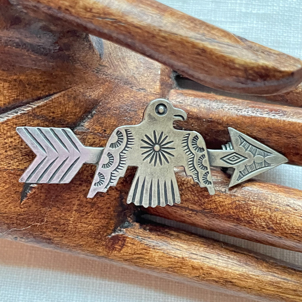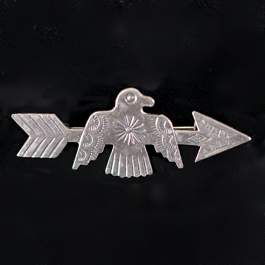 Fred Harvey era silver thunderbird sitting on an arrow. ca 1930-1940s.