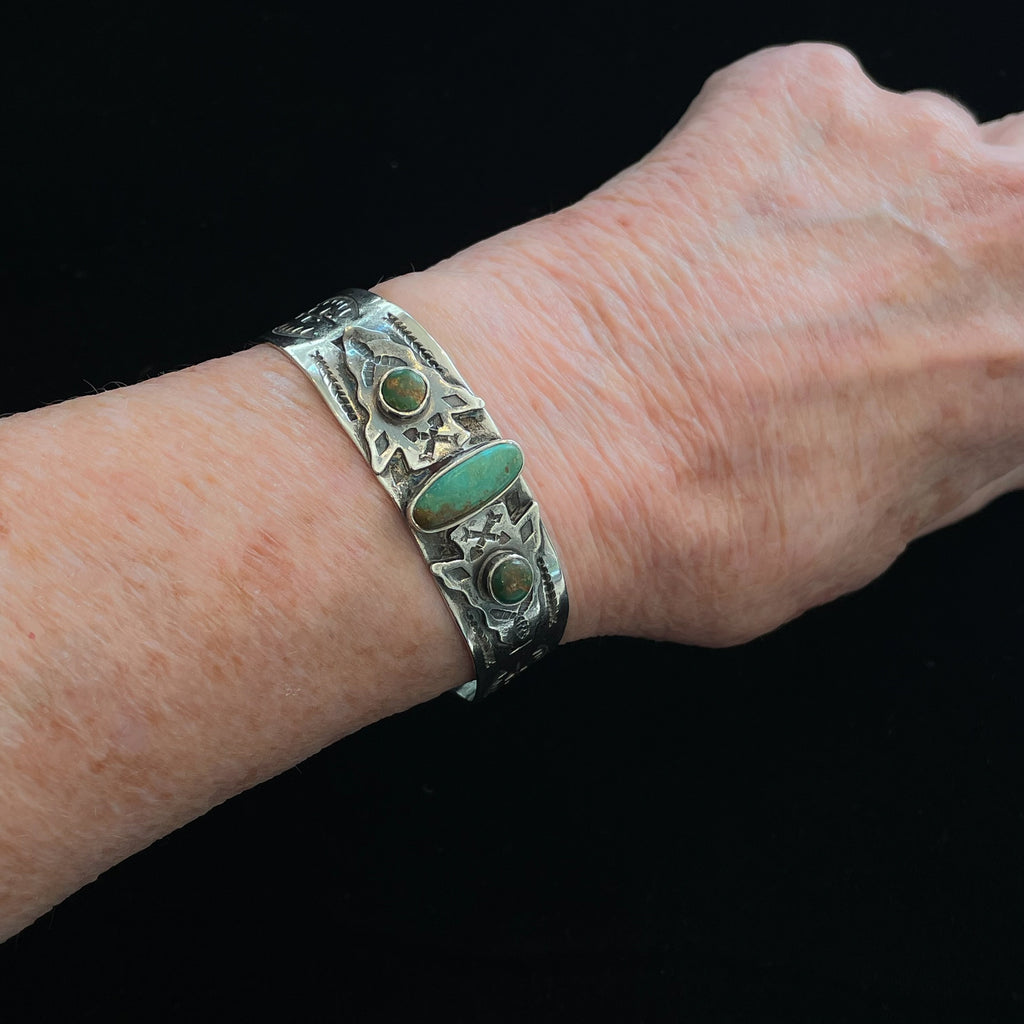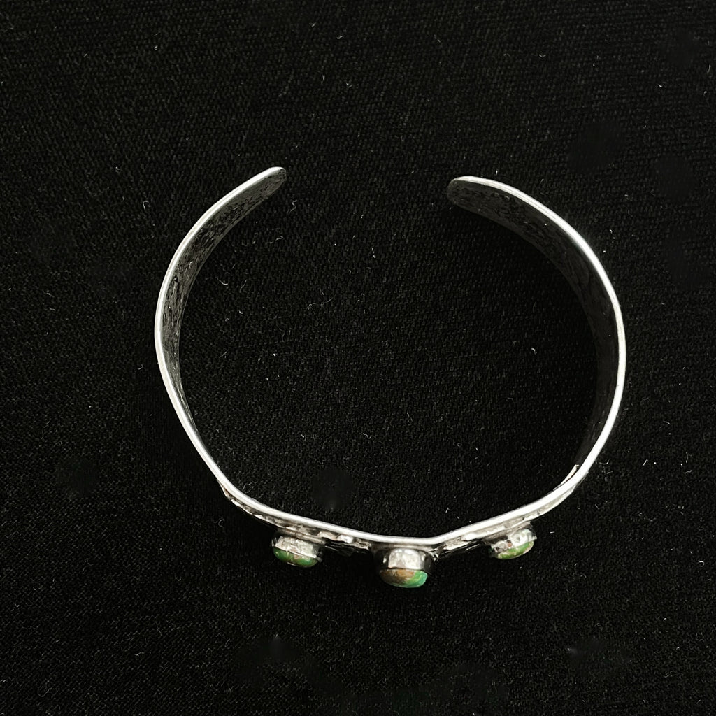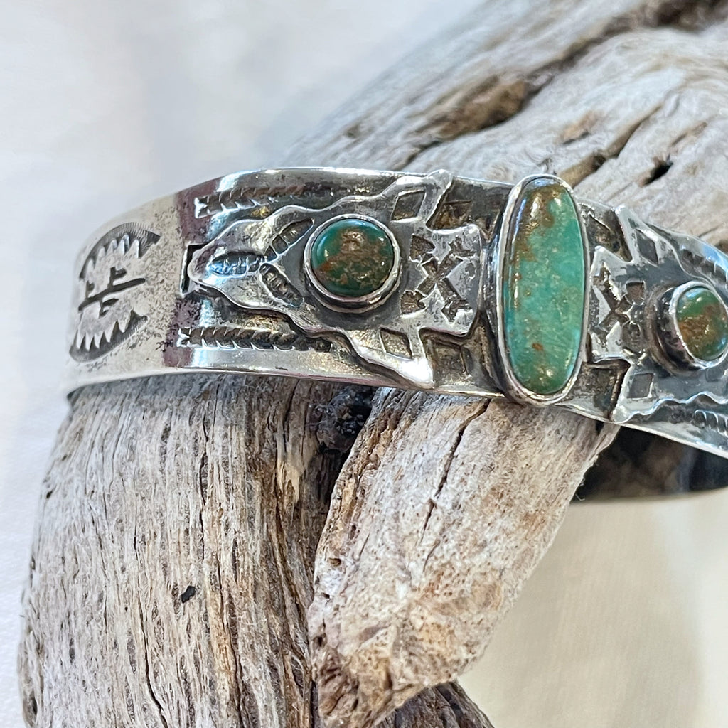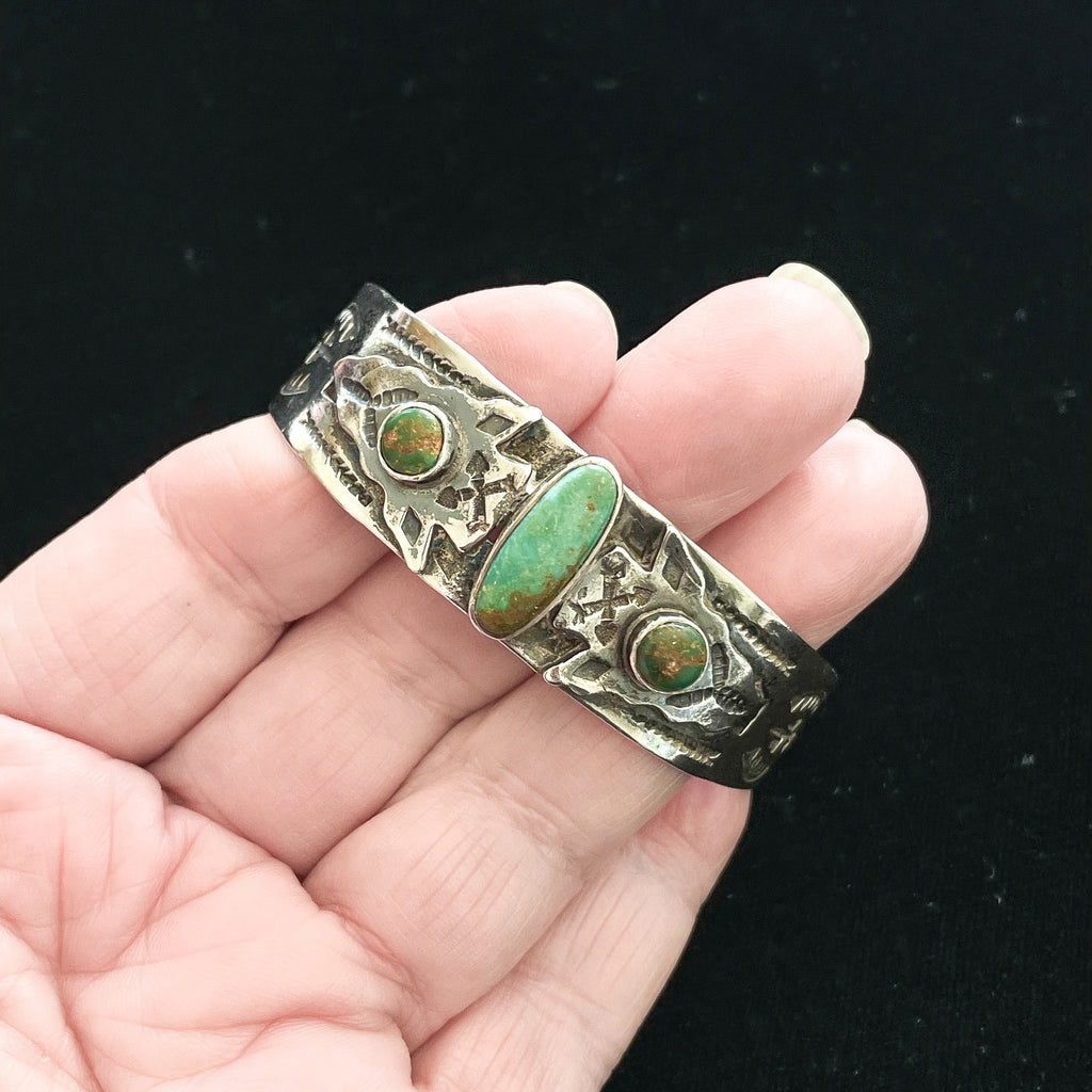 Vintage Fred Harvey era silver bracelet with a 3 turquoise (green turquoise) stones.