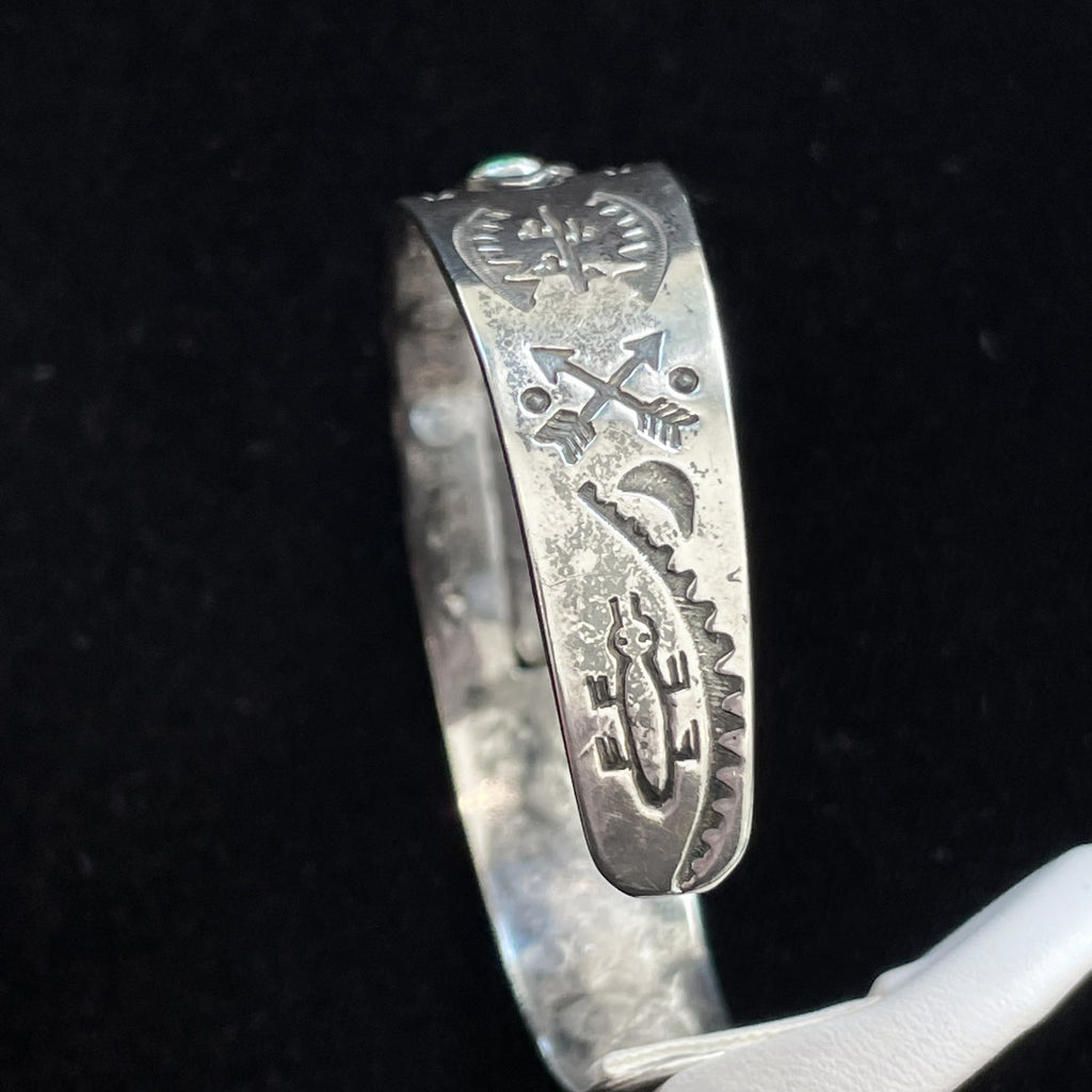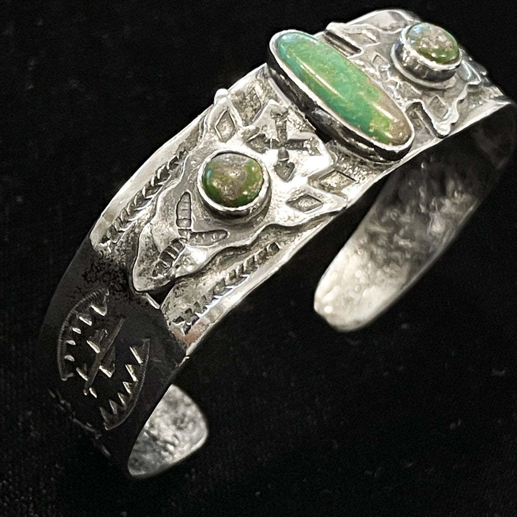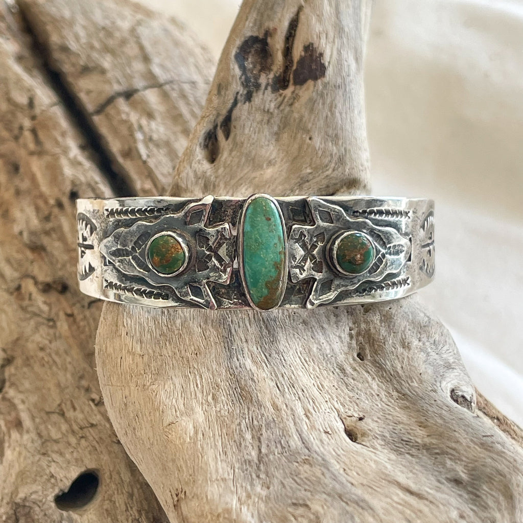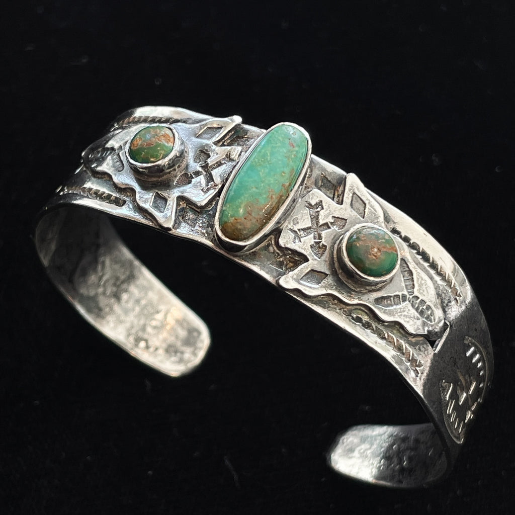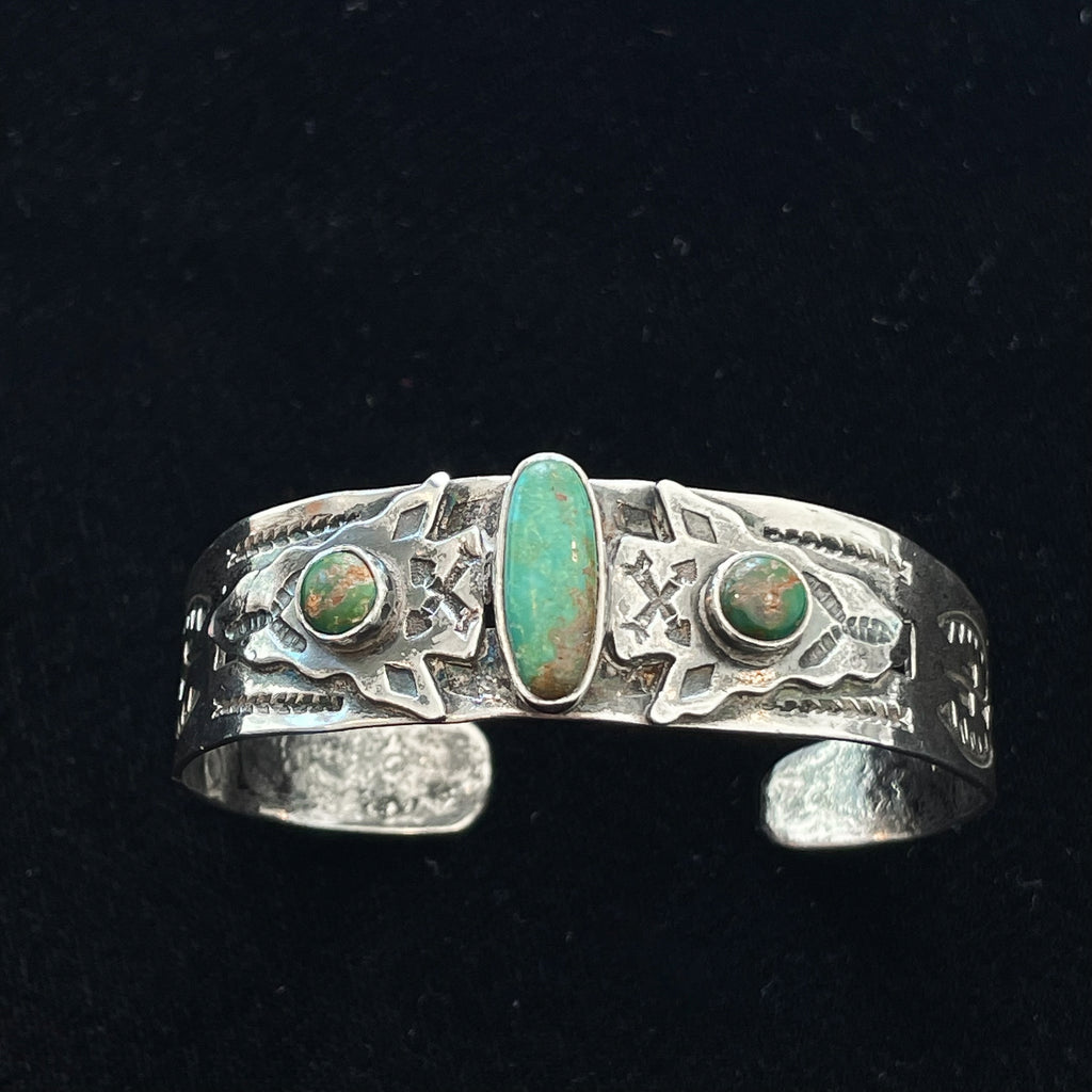 Vintage Fred Harvey era silver bracelet with a 3 turquoise (green turquoise) stones.