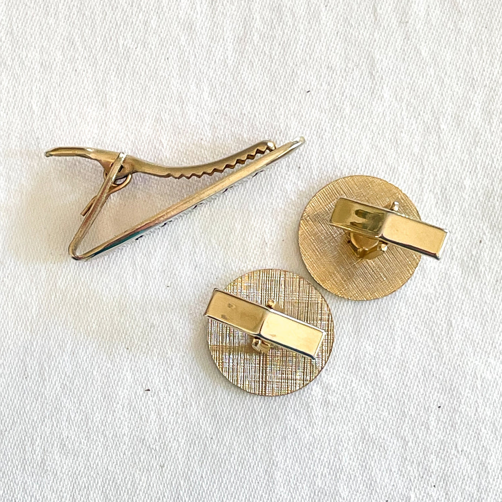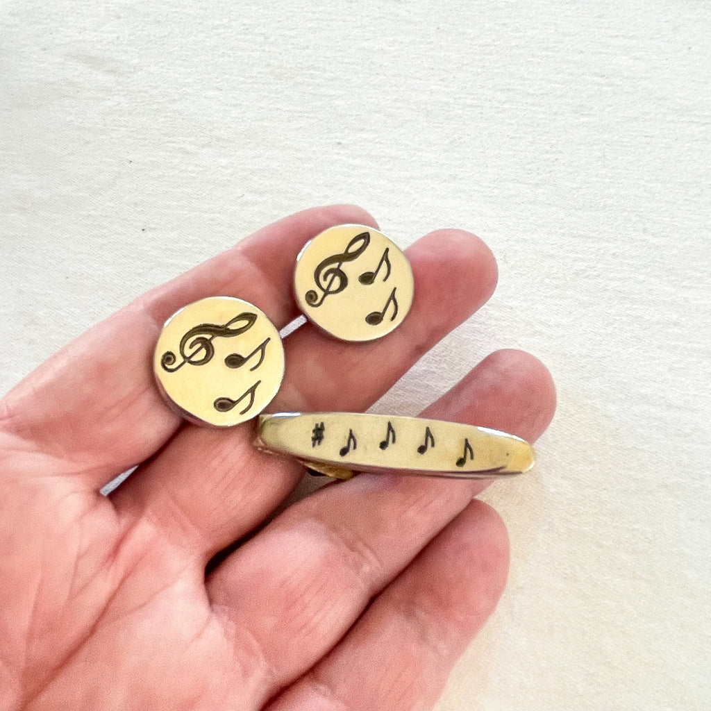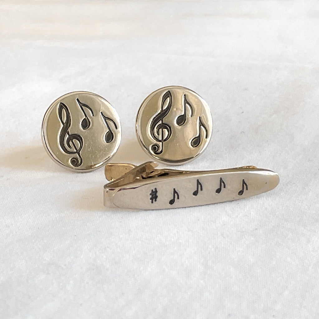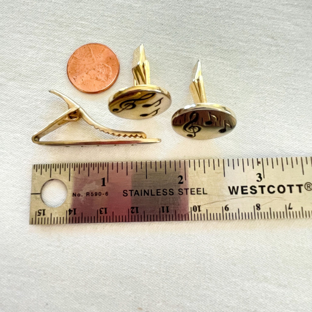 Vintage Music Note Tie Bar Cufflinks Set, Gold Tone Metal 3 Piece Set