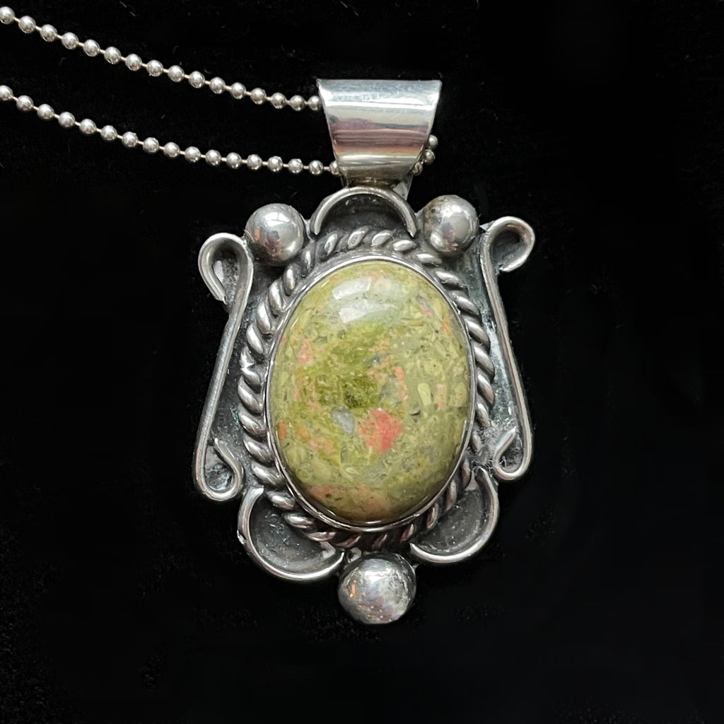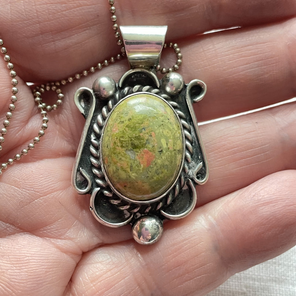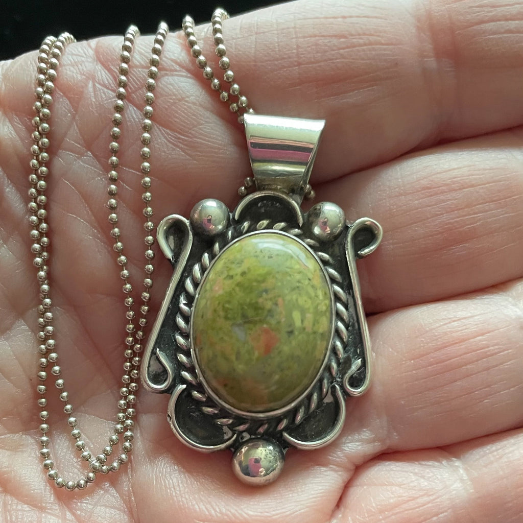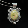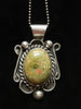 Beautiful Navajo Sterling Silver pendant with green hard stone and necklace.
