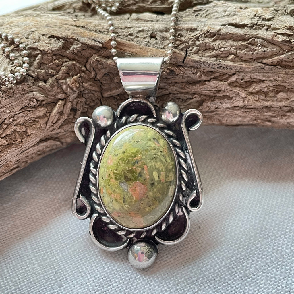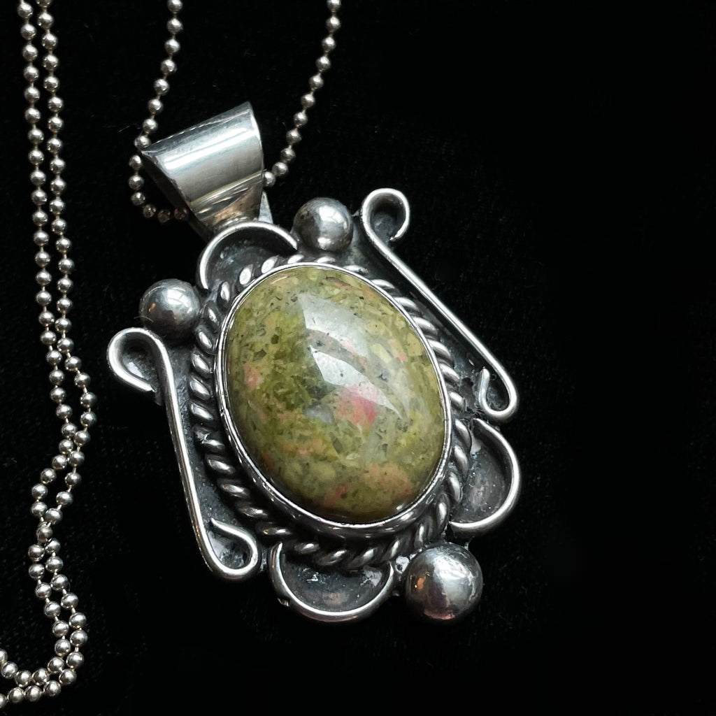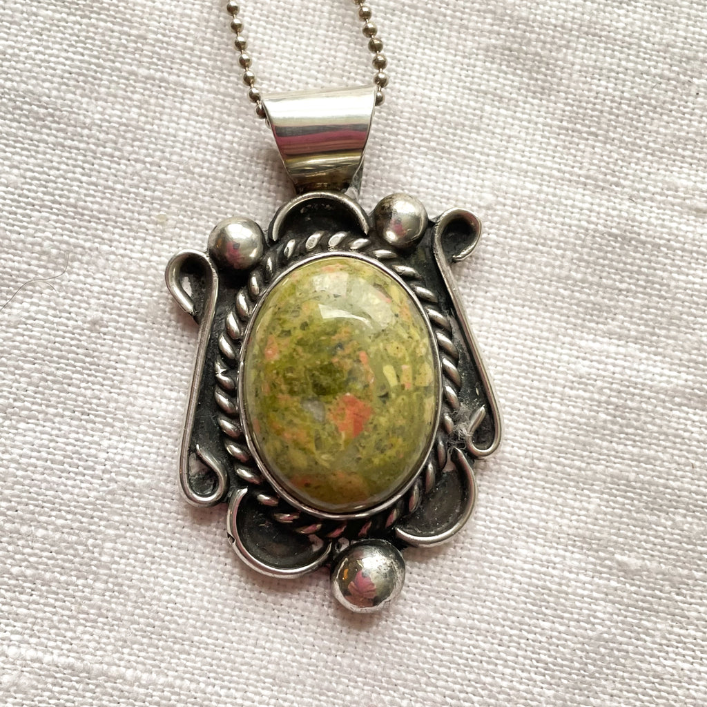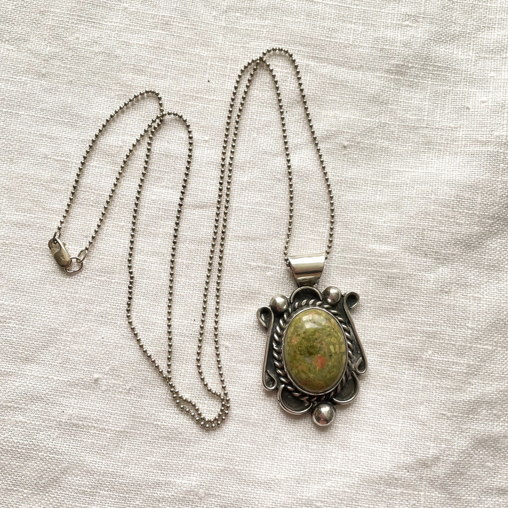 Beautiful Navajo Sterling Silver pendant with green hard stone and necklace.