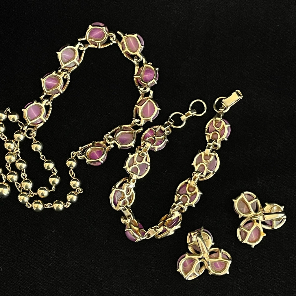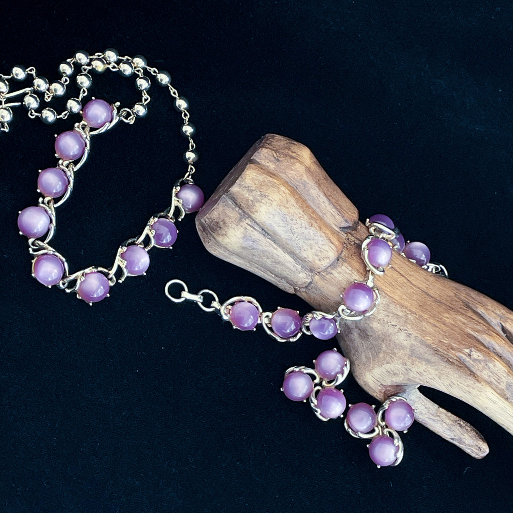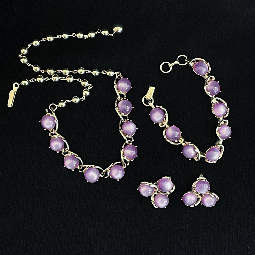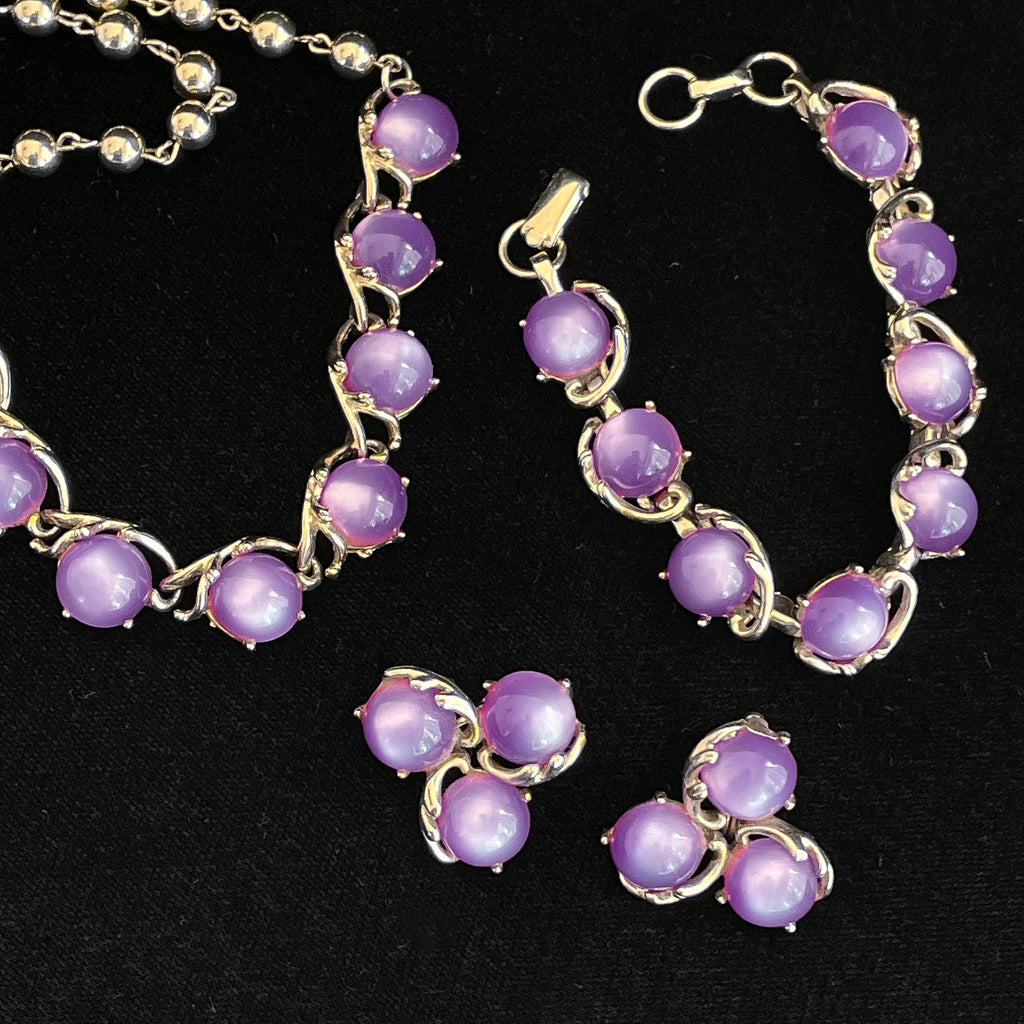 Vintage purple moonglow jewelry set including necklace, bracelet and 1 pair of earrings.
