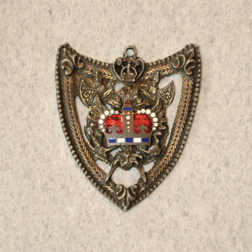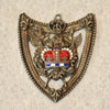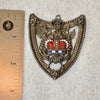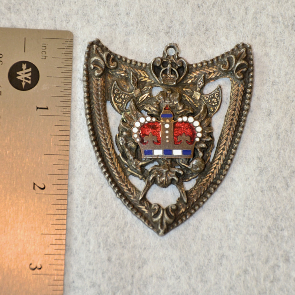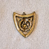 Sheild style pendant accented with swords, crown, Fleur de Lis, wings and more. Dimensional with great details.