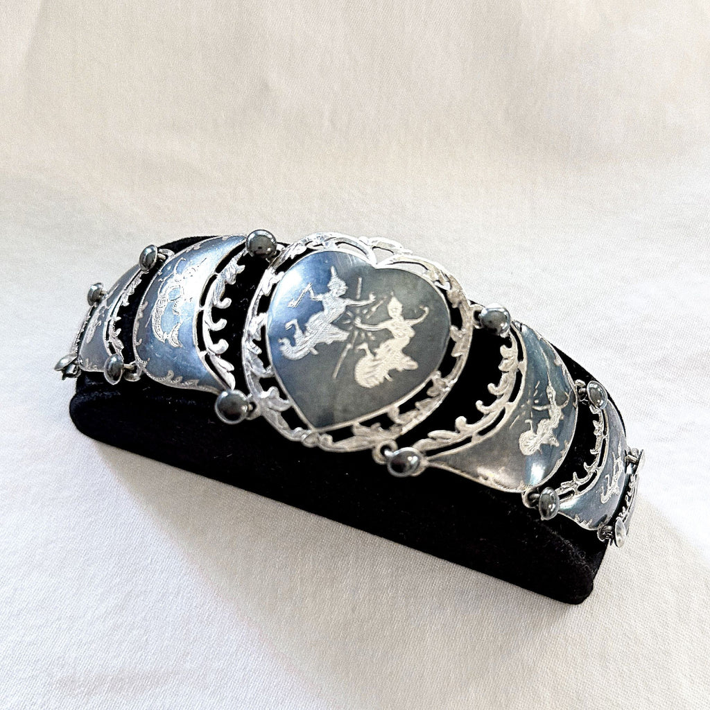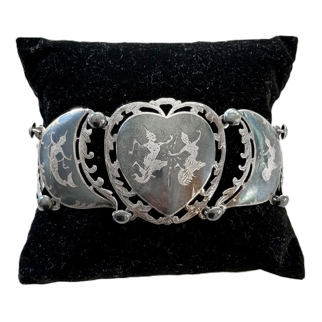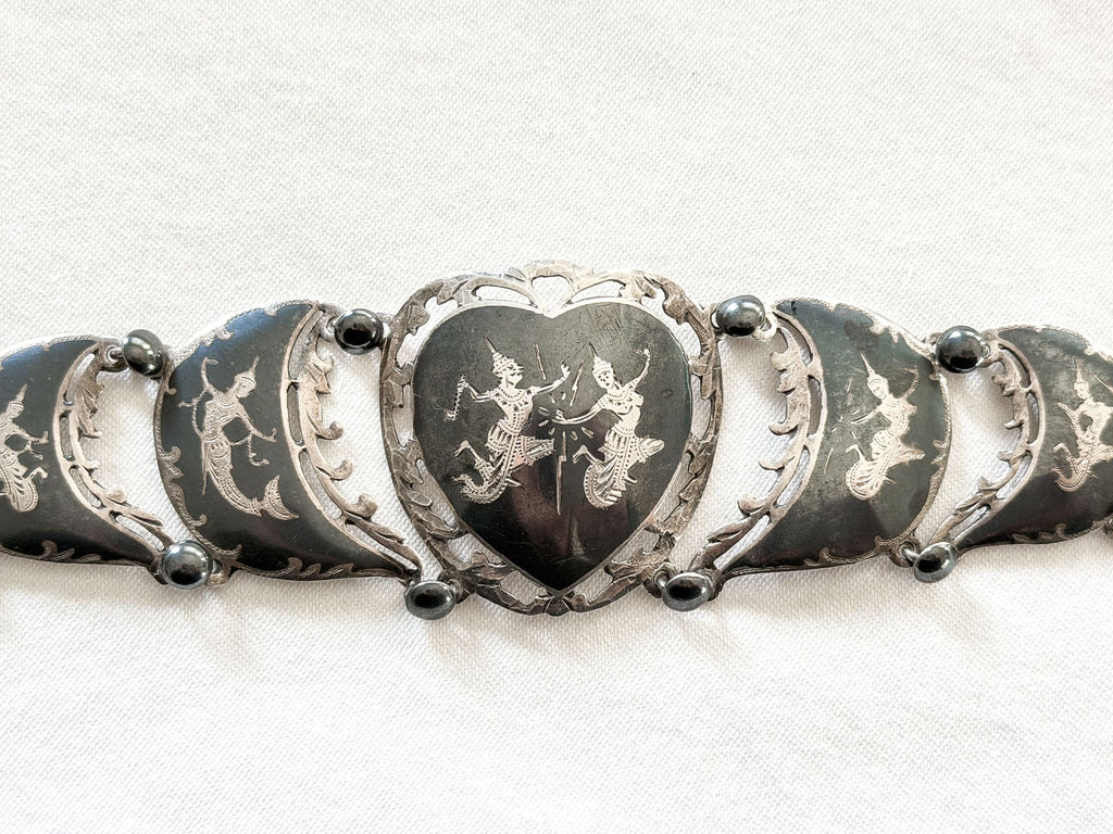Vintage sterling silver & black oxidized etched Siam bracelet.