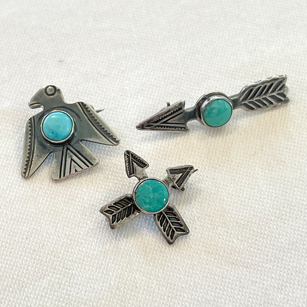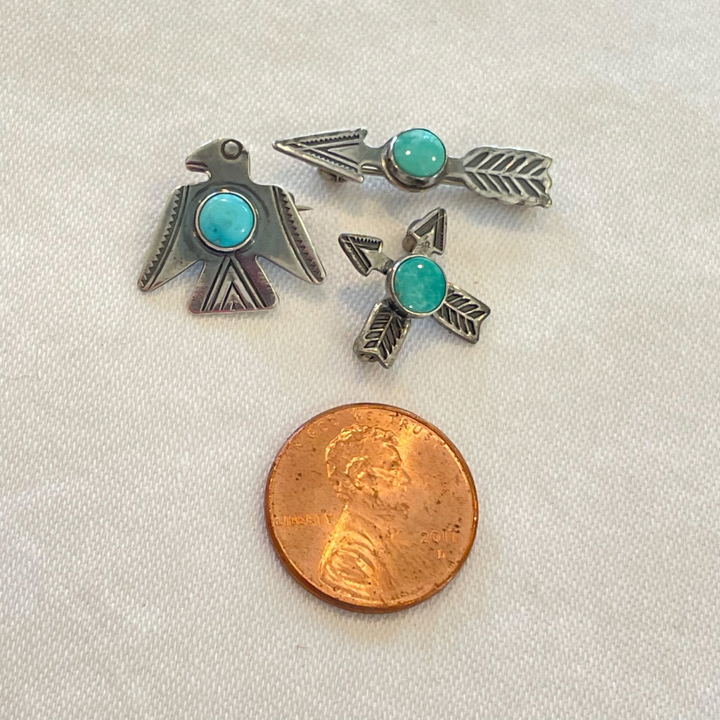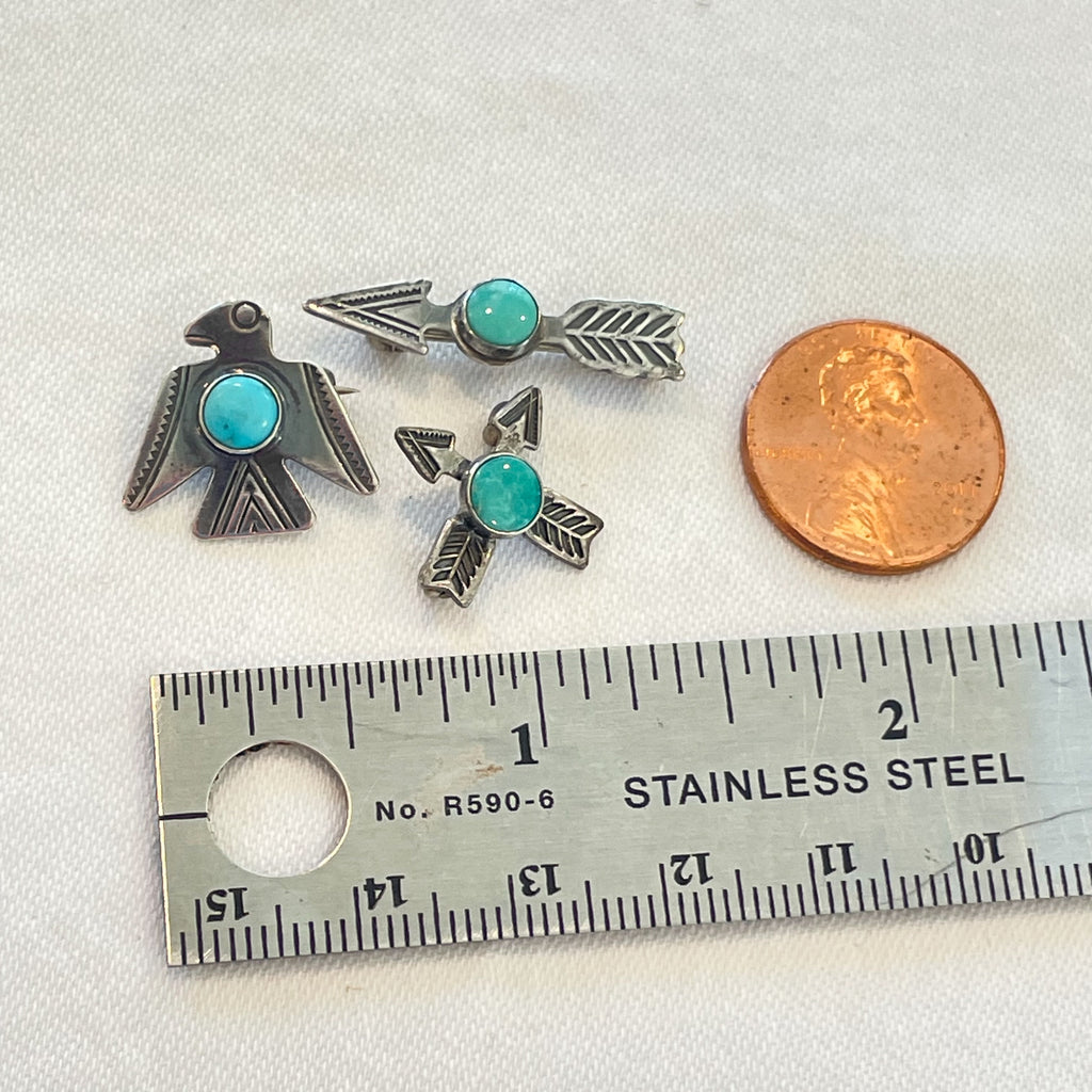 Vintage Silver Turquoise 3 Small Pin Collection, Thunderbird Arrow Crosses Lot