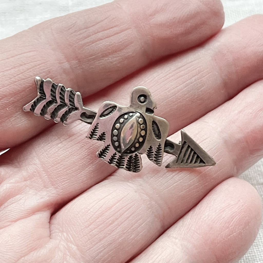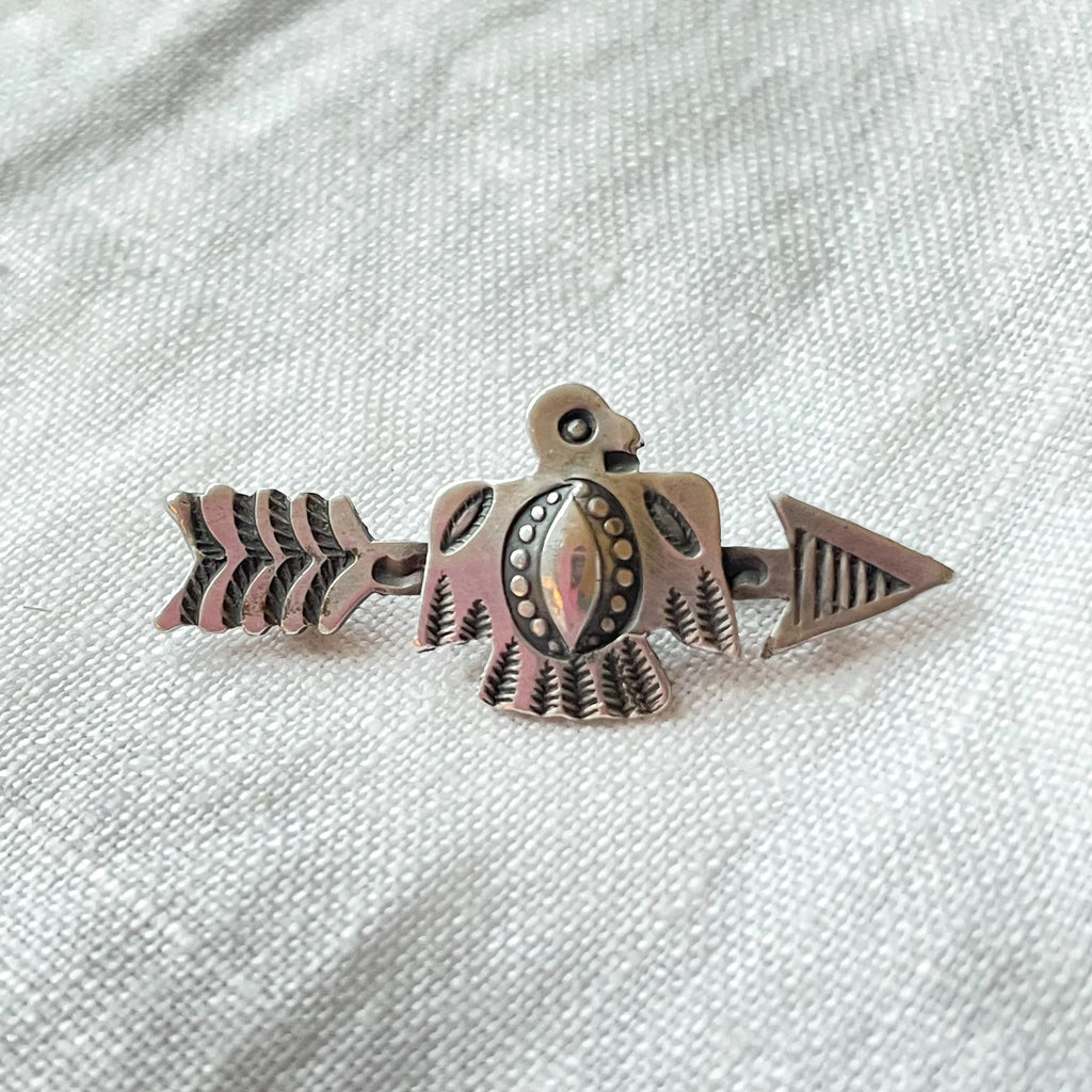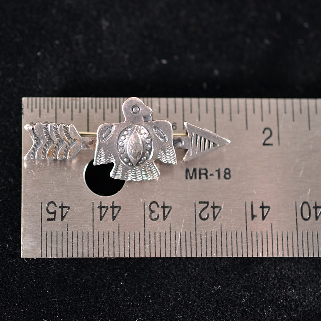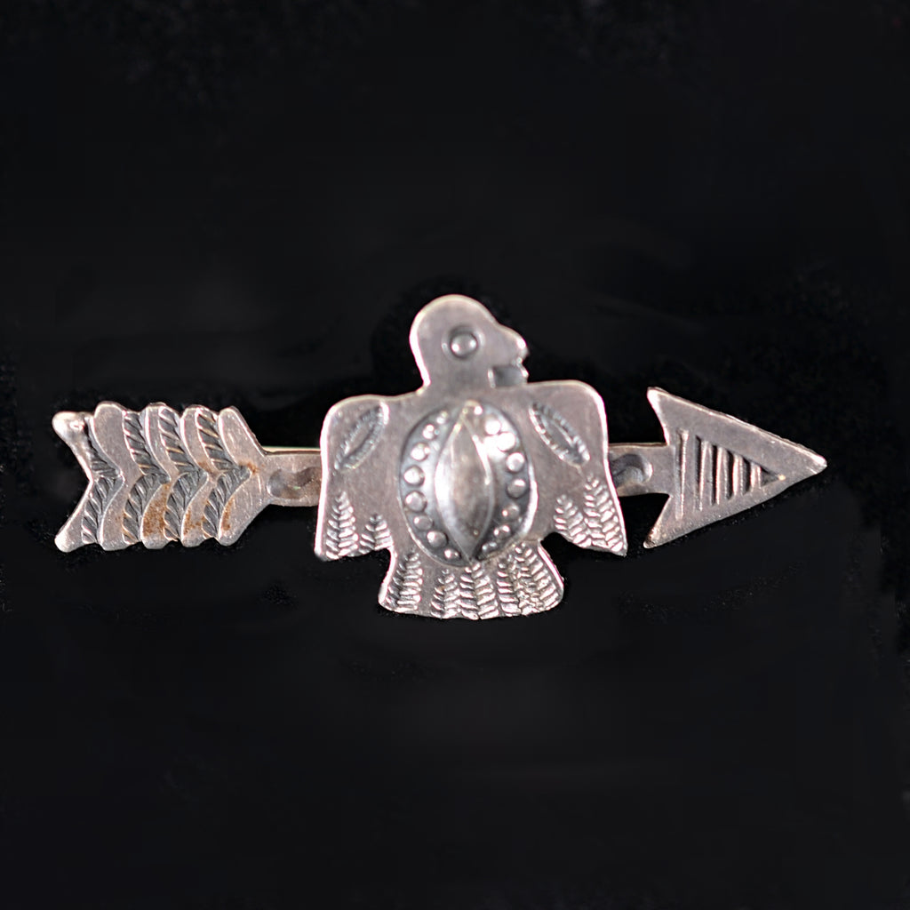 Arrow brooch with a small thunderbird in the center. The bird has a raised chest.