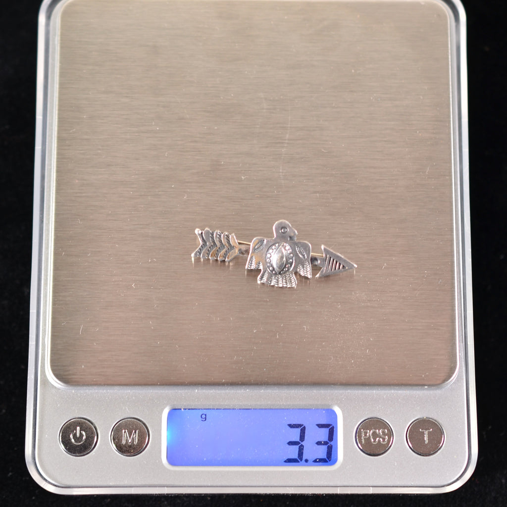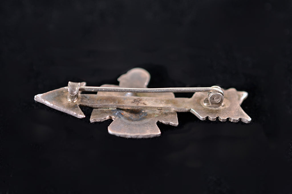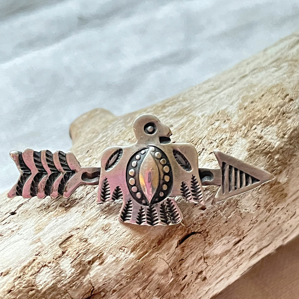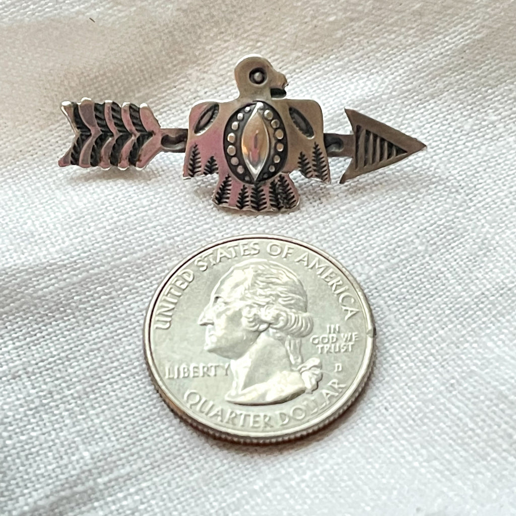 Arrow brooch with a small thunderbird in the center. The bird has a raised chest.