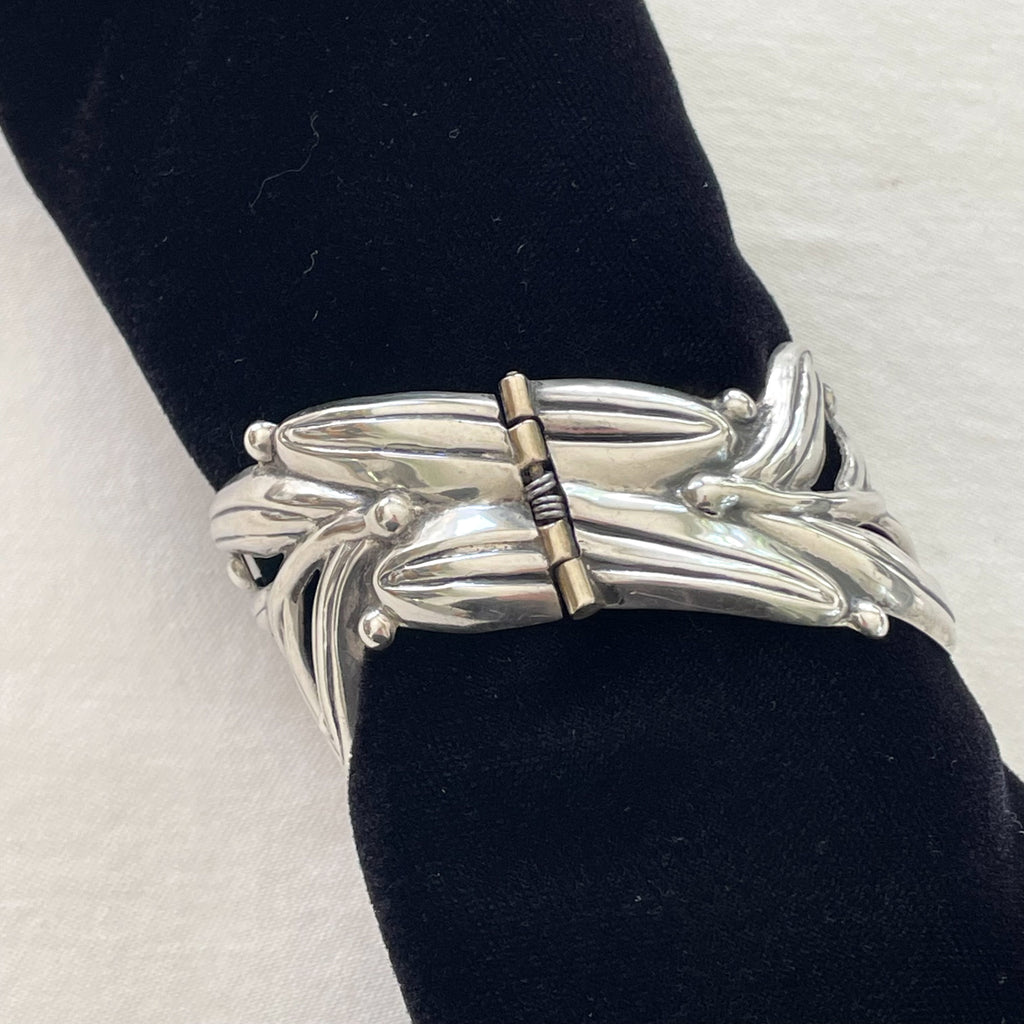 Vintage Sterling silver wrap clamper bracelet with hinge. Adjustable sizing. This bracelet fits smaller wrist well.