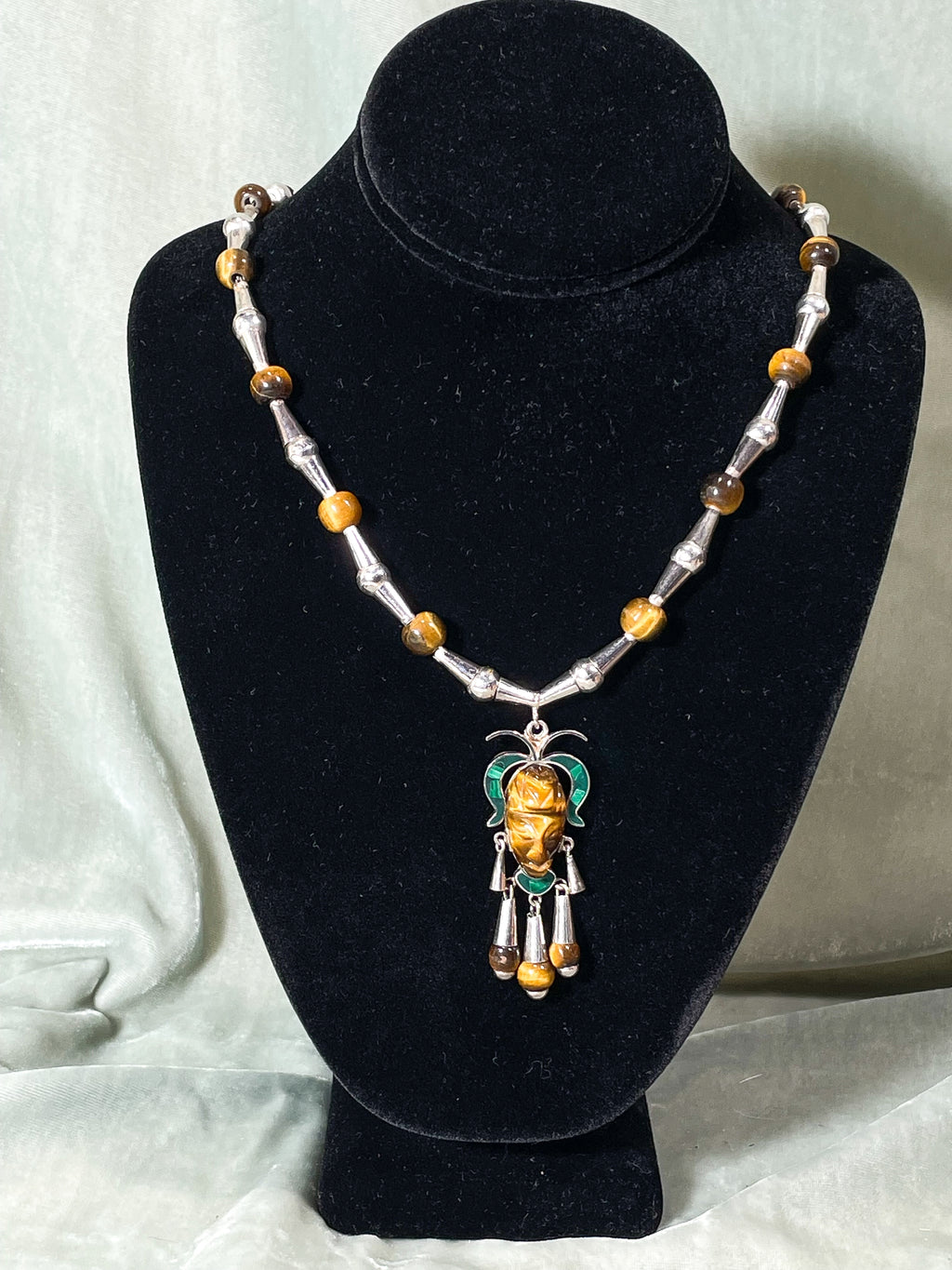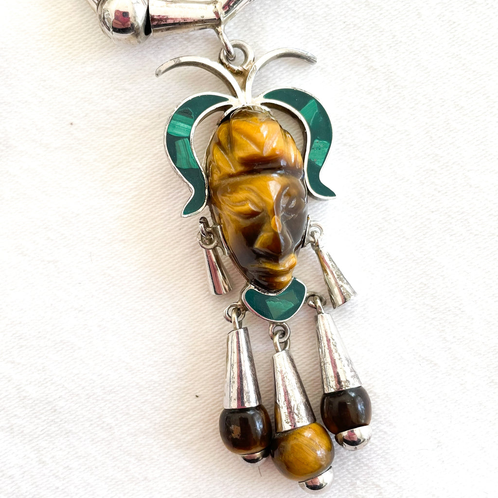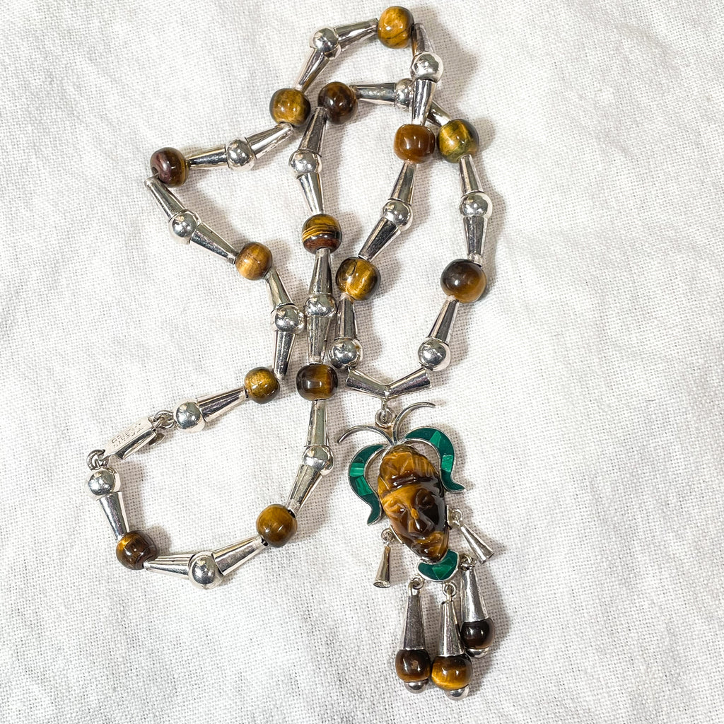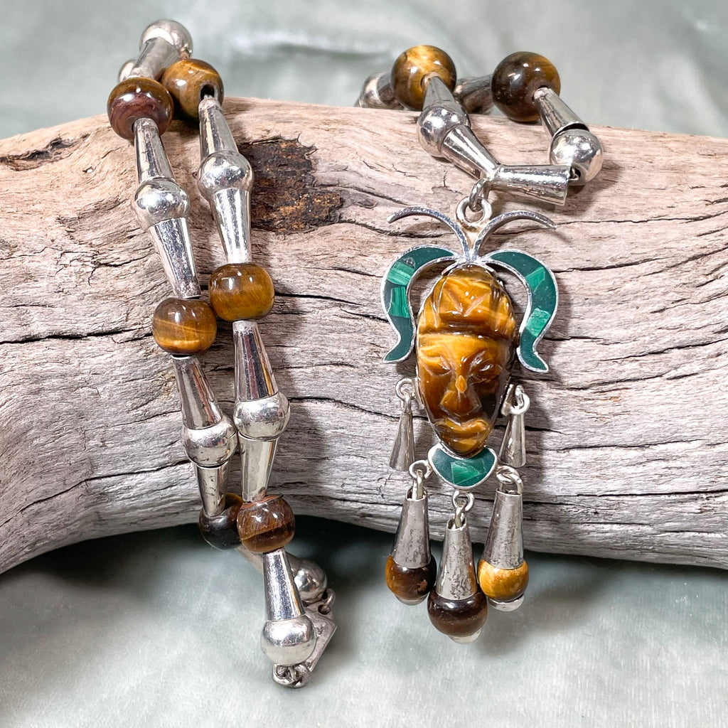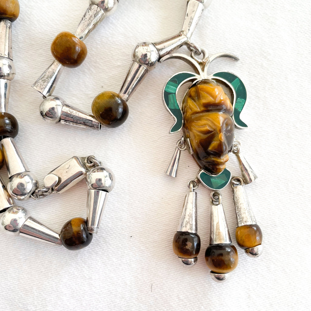 Handmade necklace, silver and tiger's eye carved face & beads, malachite inlay details.