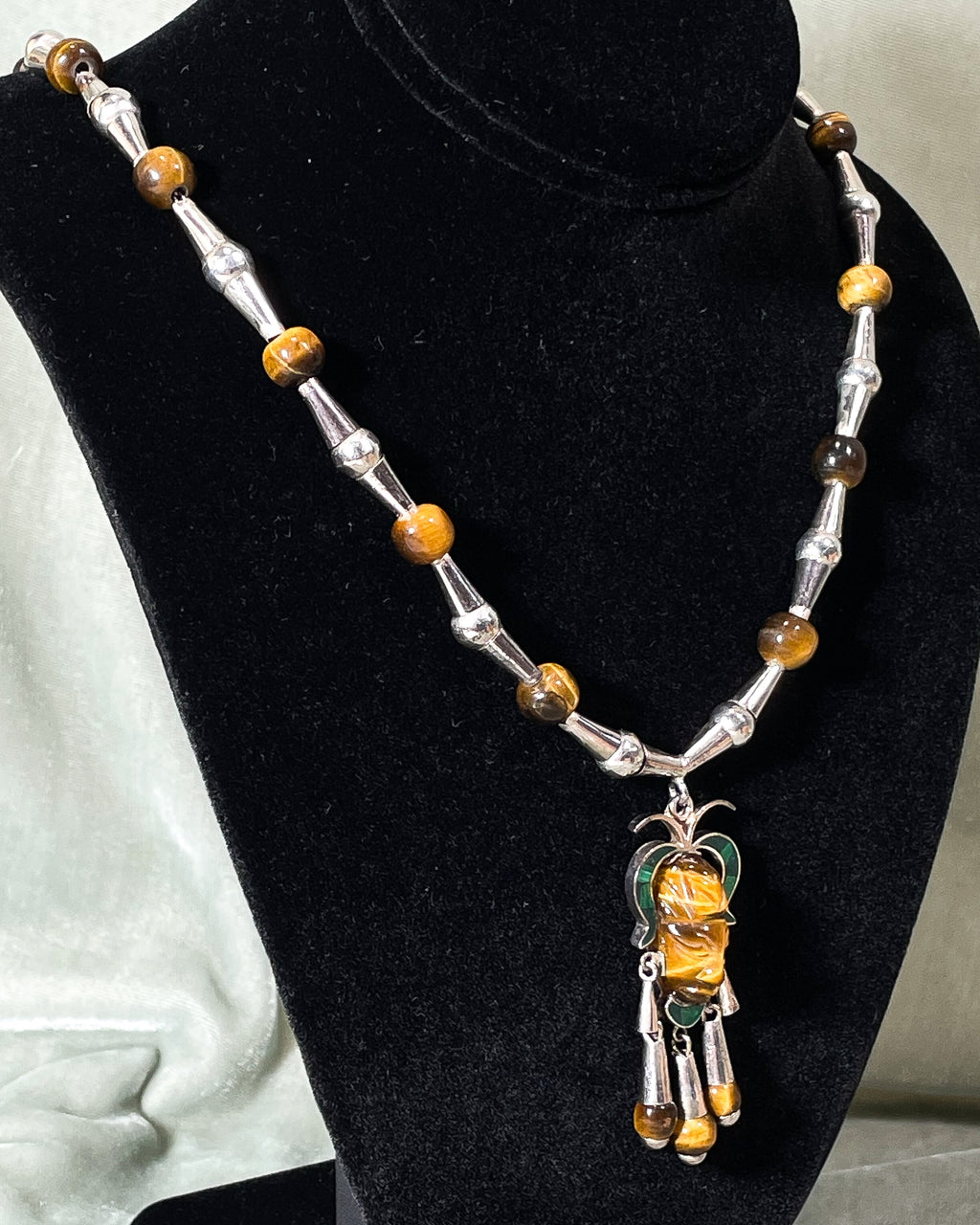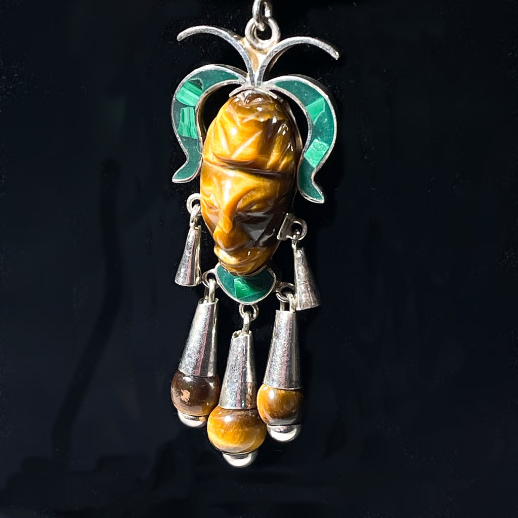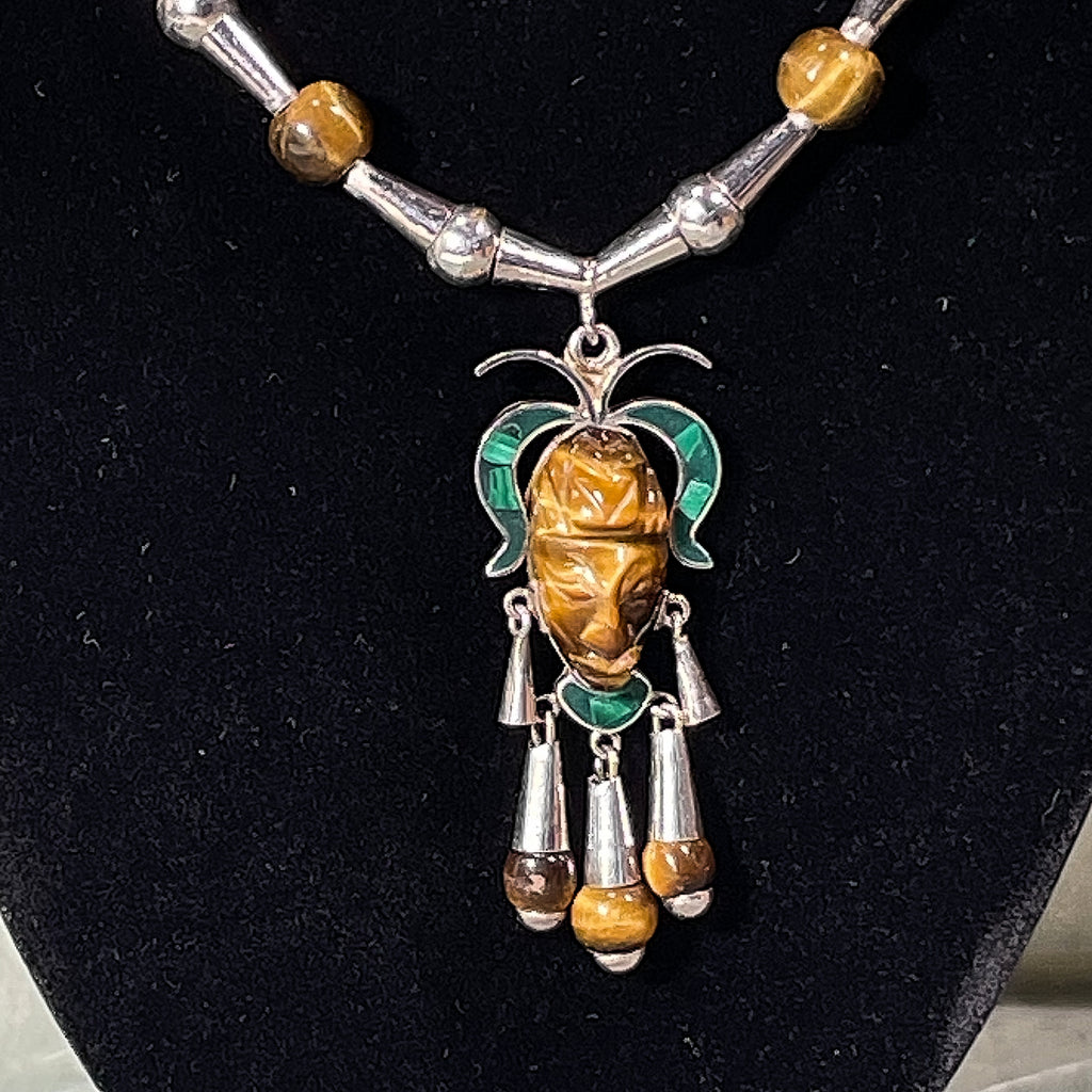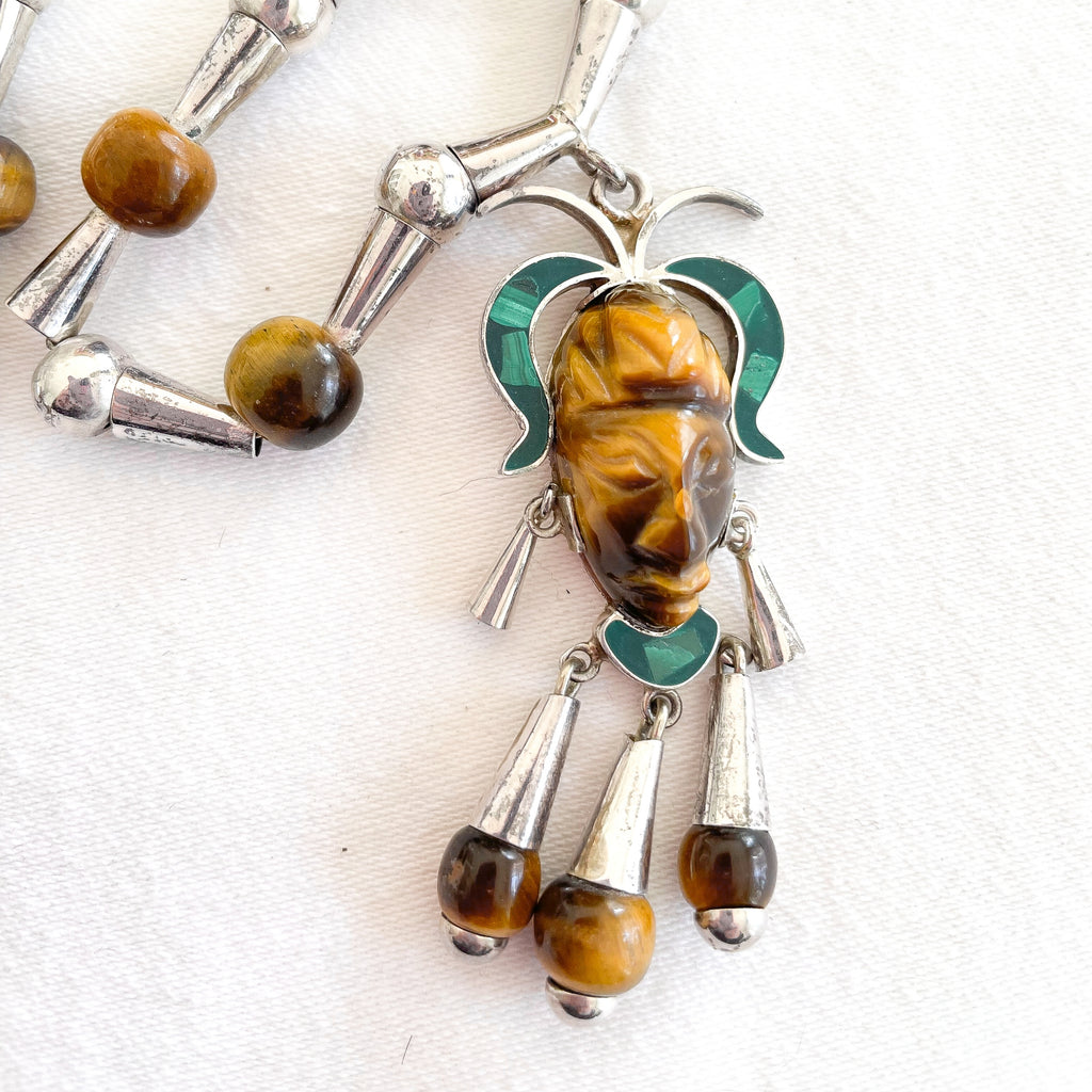 Handmade necklace, silver and tiger's eye carved face & beads, malachite inlay details.