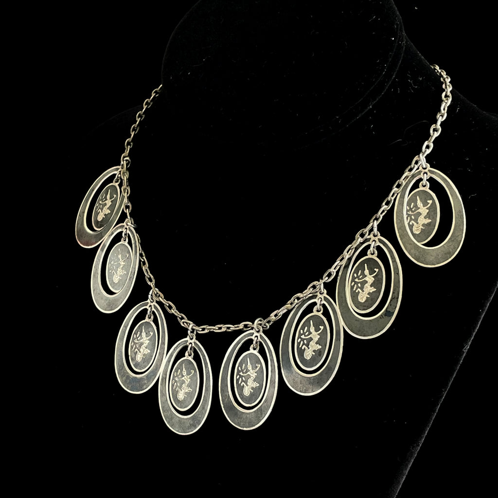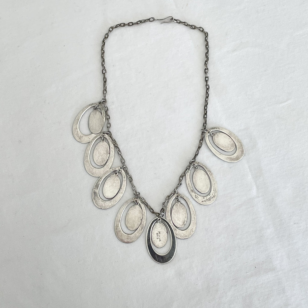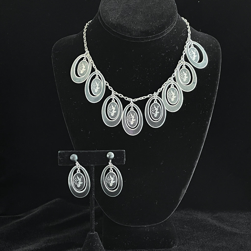 7 etched discs on a silver chain necklace with matching pair of earrings. Articulated discs.