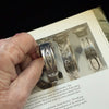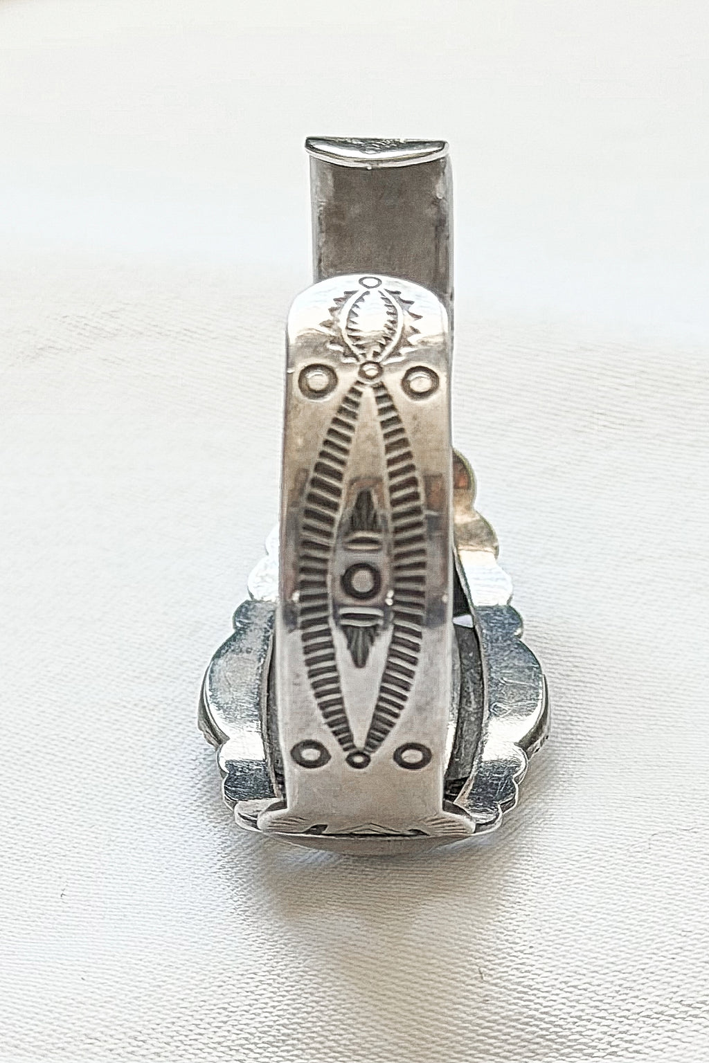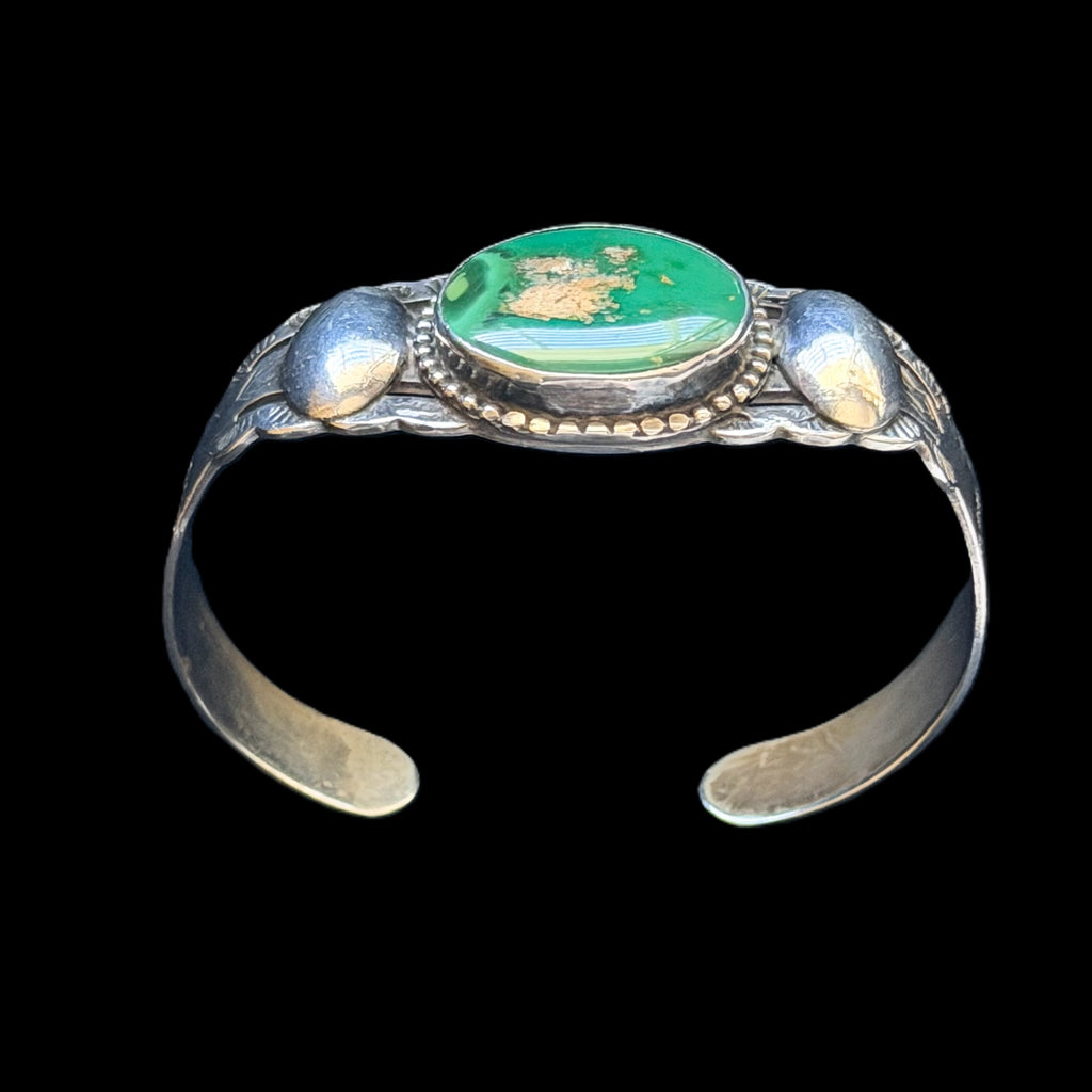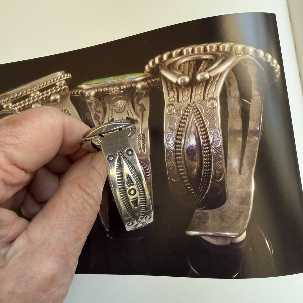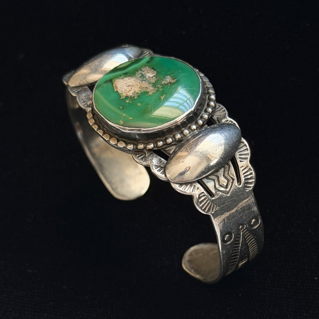 Round green turquoise stone in the center of the bracelet, flanked by oval raised silver beads, stamping on the sides of the bracelet. Some photos taken on images shown from Fred Harvey book to illustrate stamping.