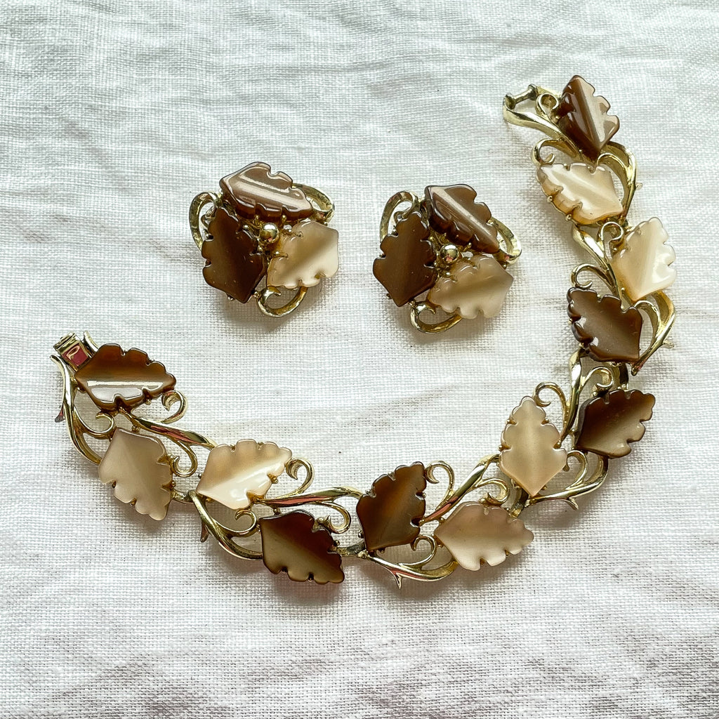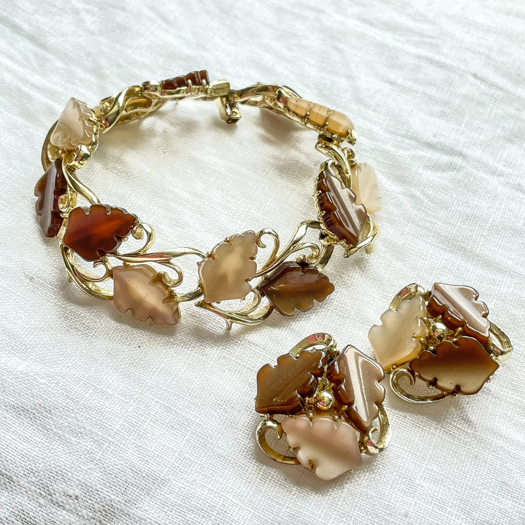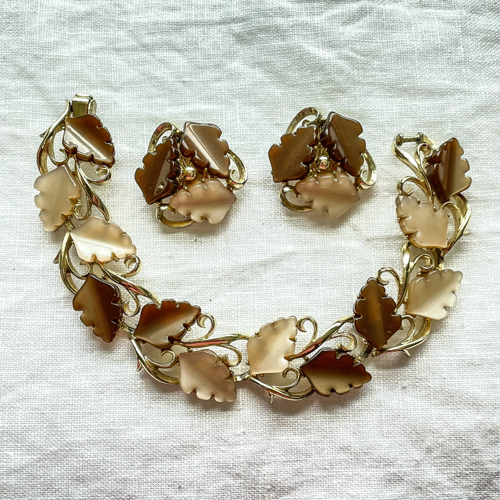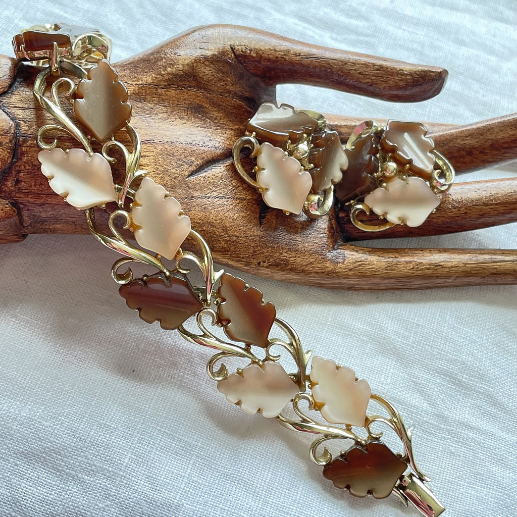 Vintage MCM leaf pattern thermoset bracelet and earring set.
