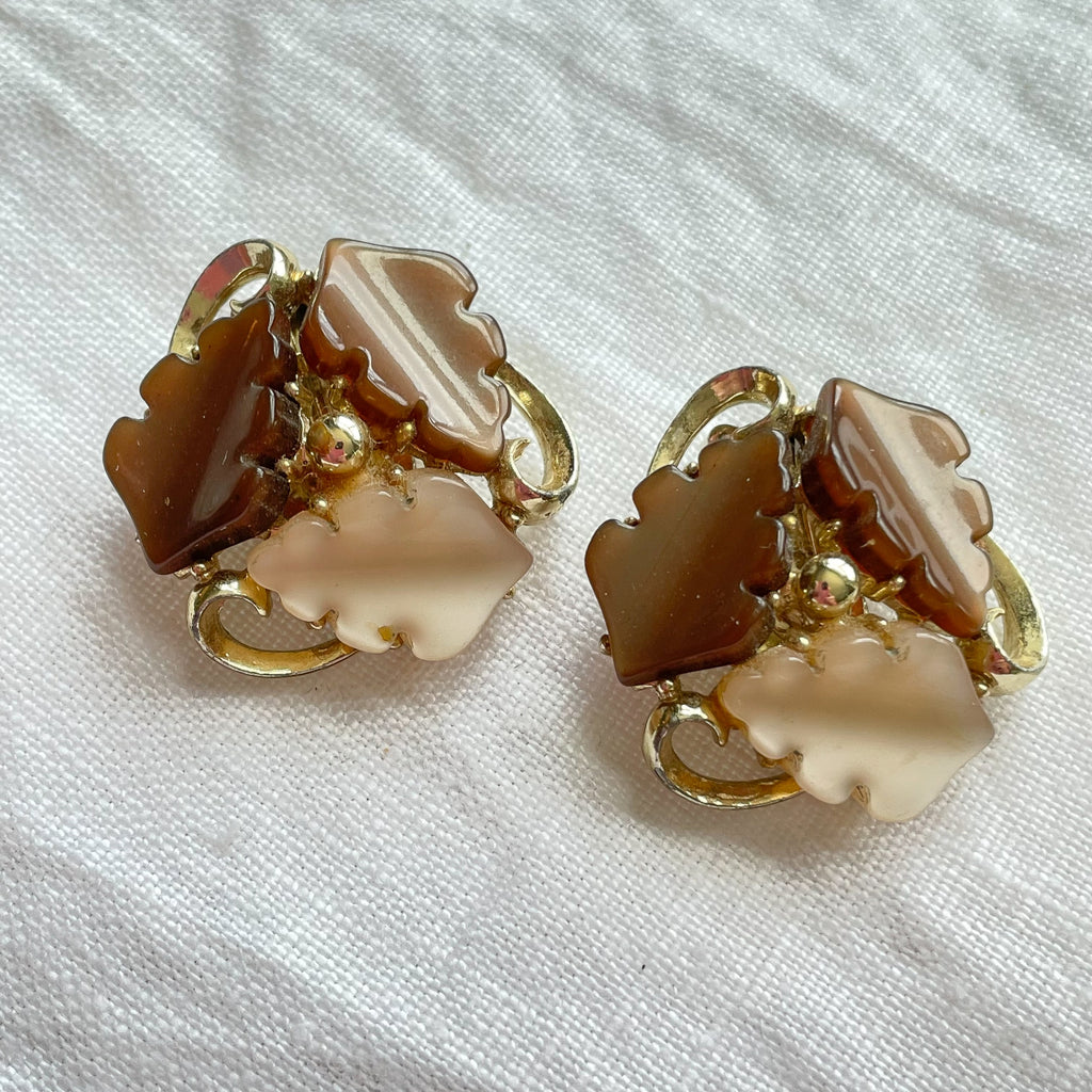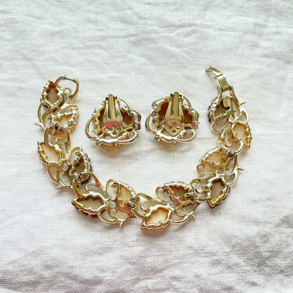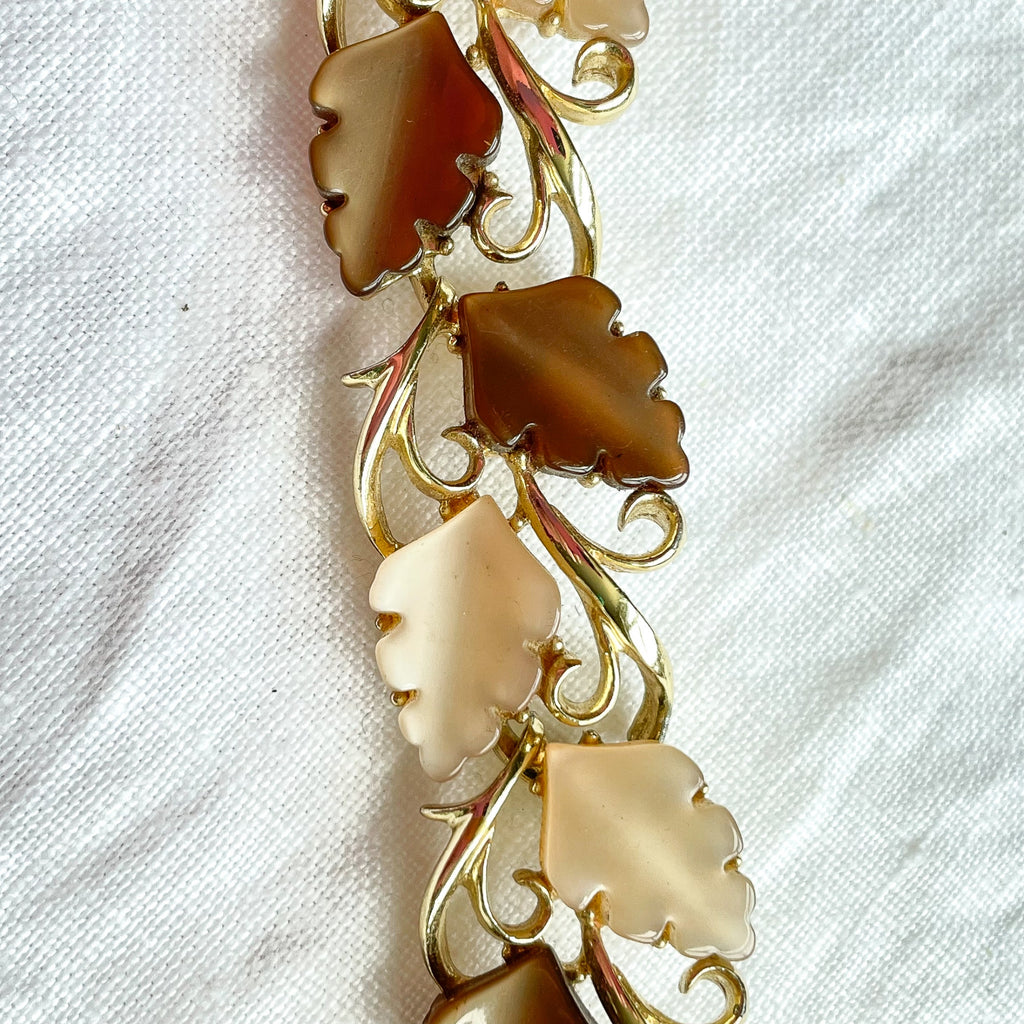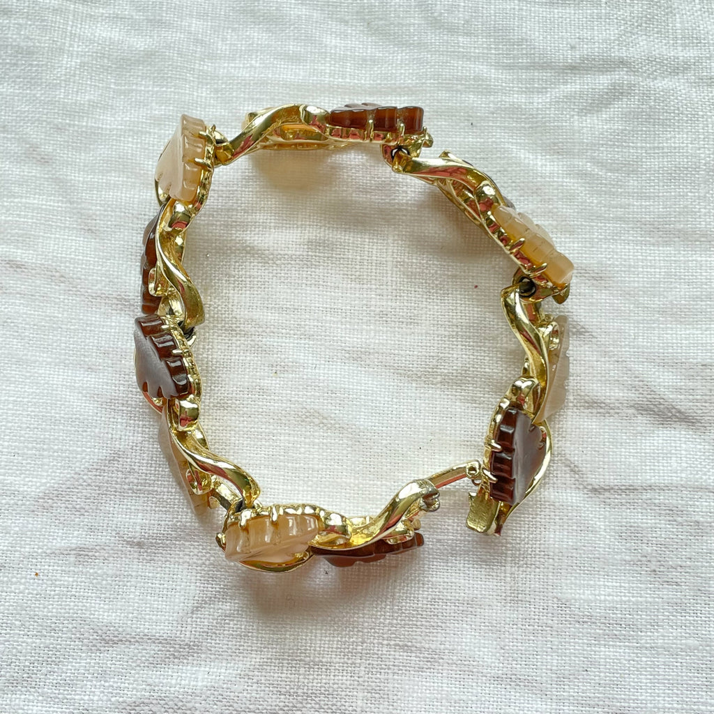 Vintage MCM leaf pattern thermoset bracelet and earring set.