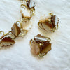 The gold tone metal is open with swirl designs. Prong set leaf stones.