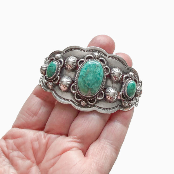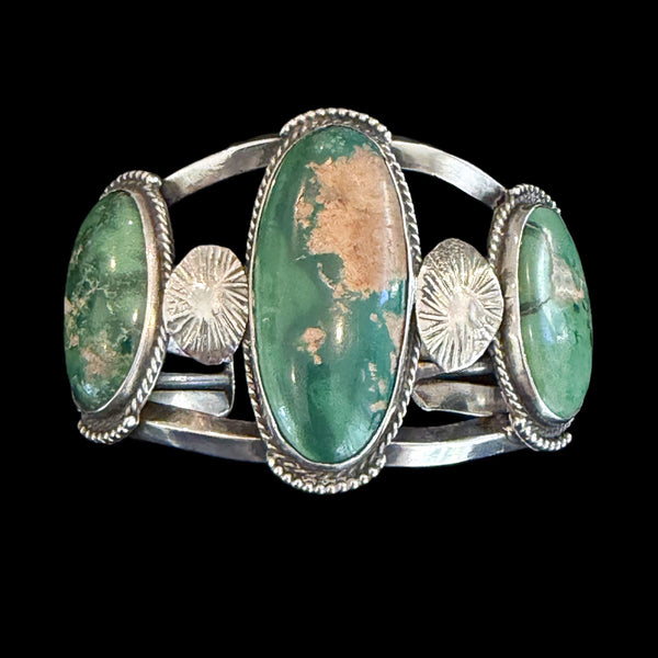 Vintage 1940s Navajo Sterling Silver Turquoise Cluster Cuff Bracelet 55.1 Grams