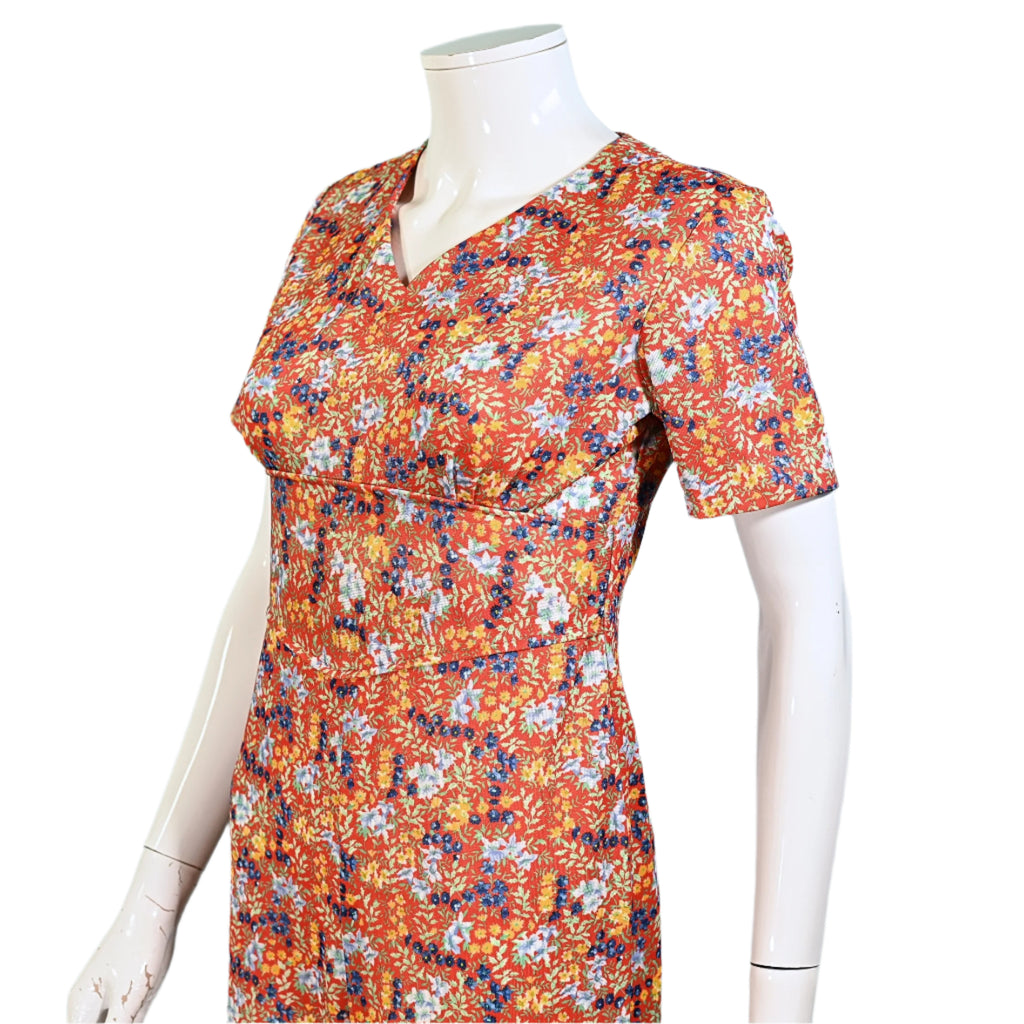 Bright floral print: red, yellow, blue mint green.