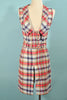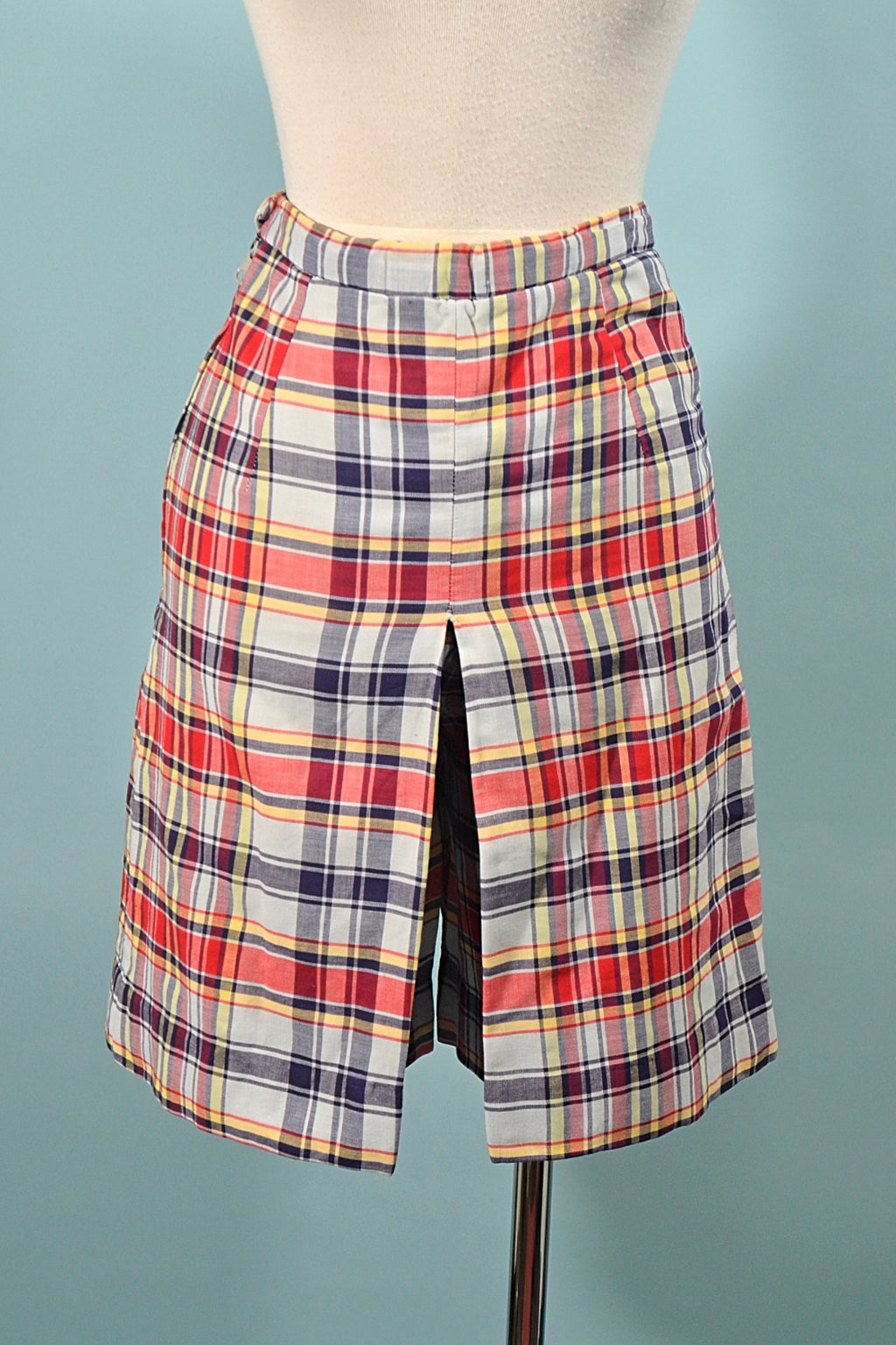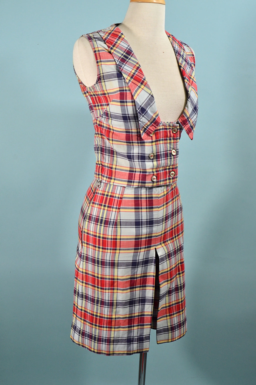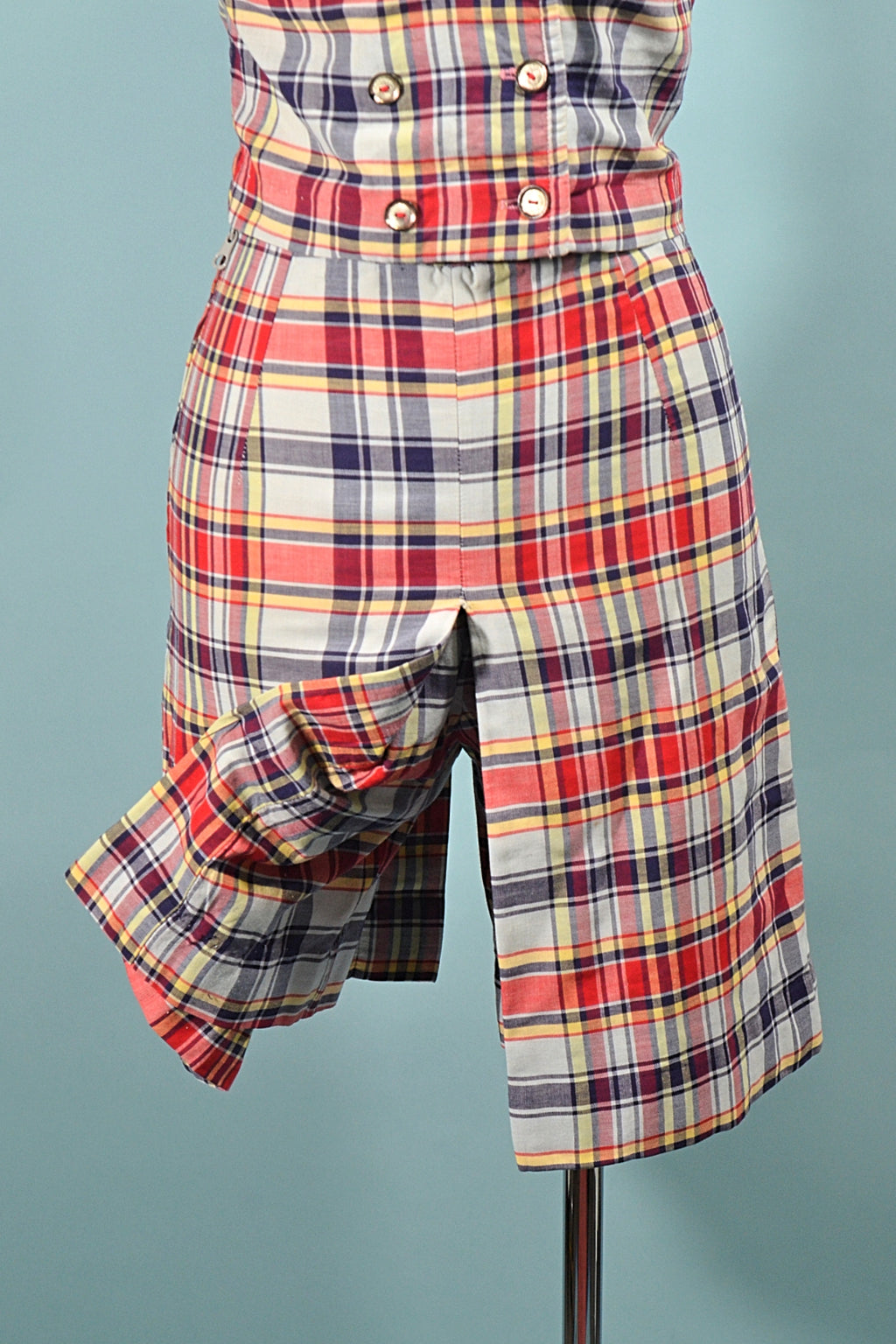 There are darts on the front at the bustline. This is a junior-size outfit.