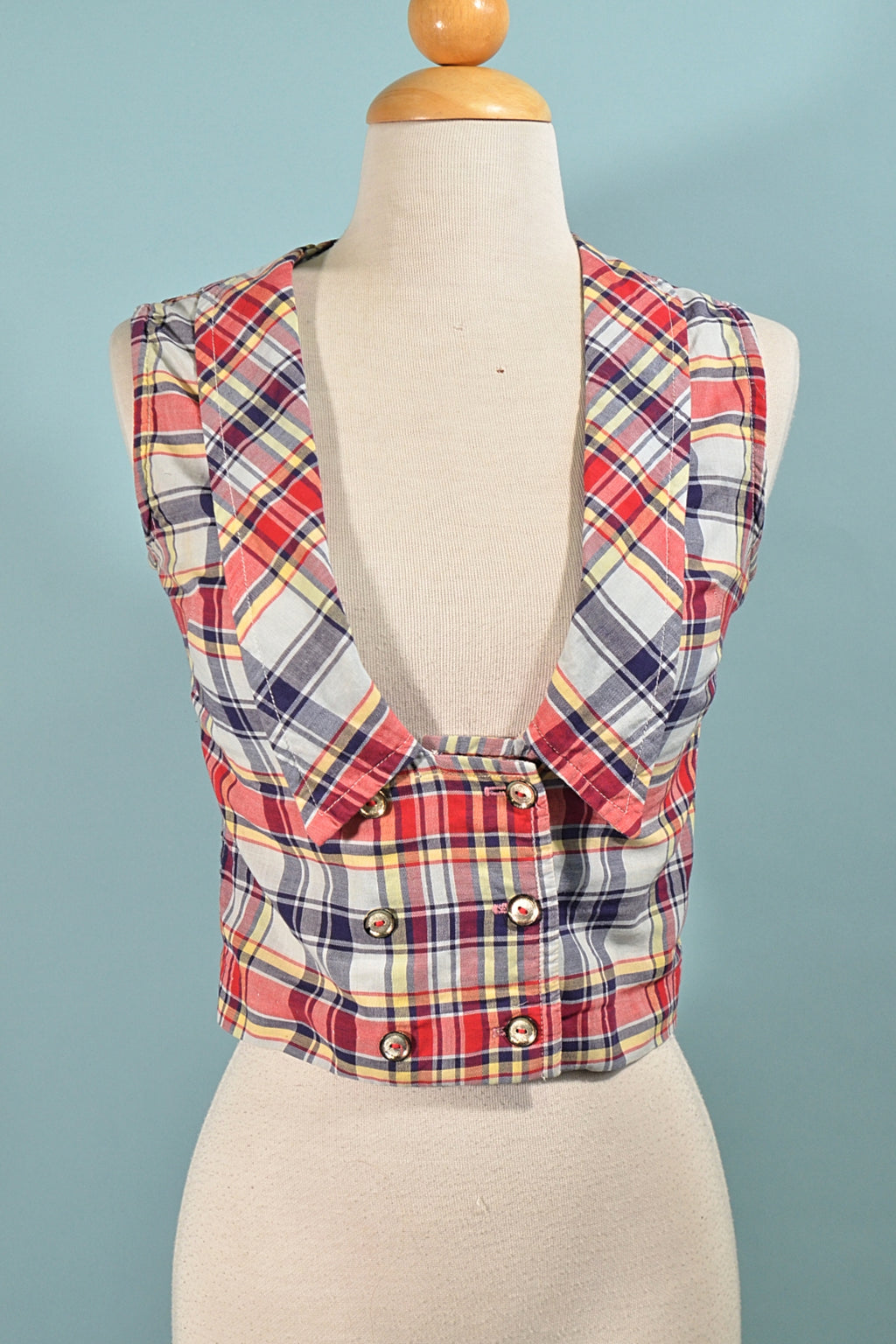 Sleeveless top with a large collar, deep neckline and button closure on the front.
