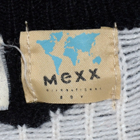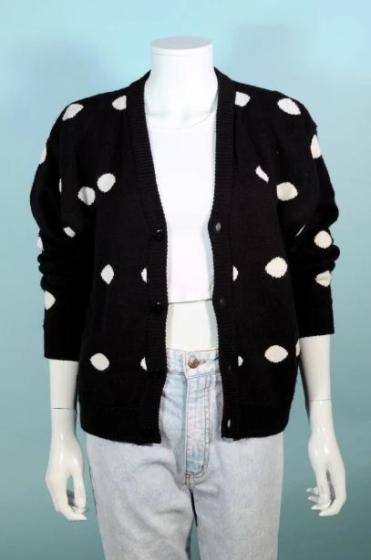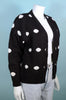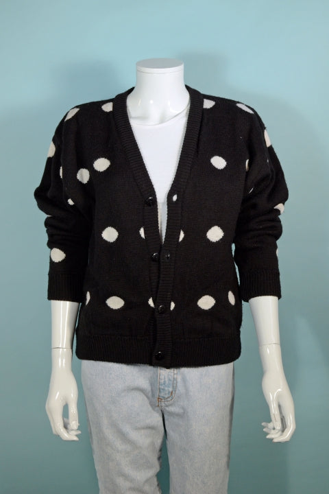 Vintage 80s Black cardigan with large white polka dots. V neckline. Dropped shoulders. Sweater has a secondary knit lining. Buttons up front. Loose fit on top and in the sleeve. Knit ribbed banding at sleeve and waistband.