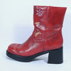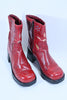 90s red leather boots with flower insets. Wide rounded wide toes, chunky style with wide chunky heels and platforms. Bratz style.
