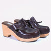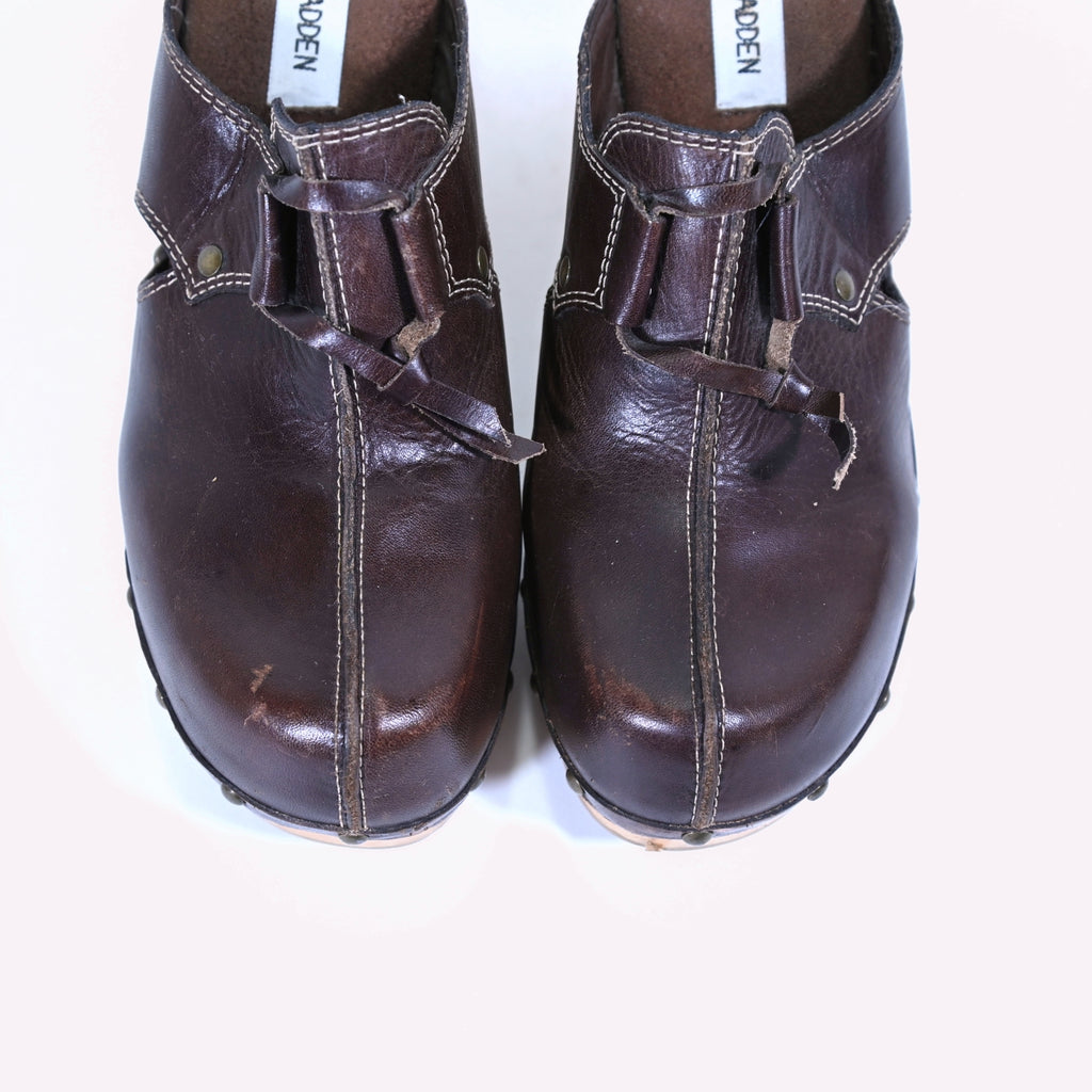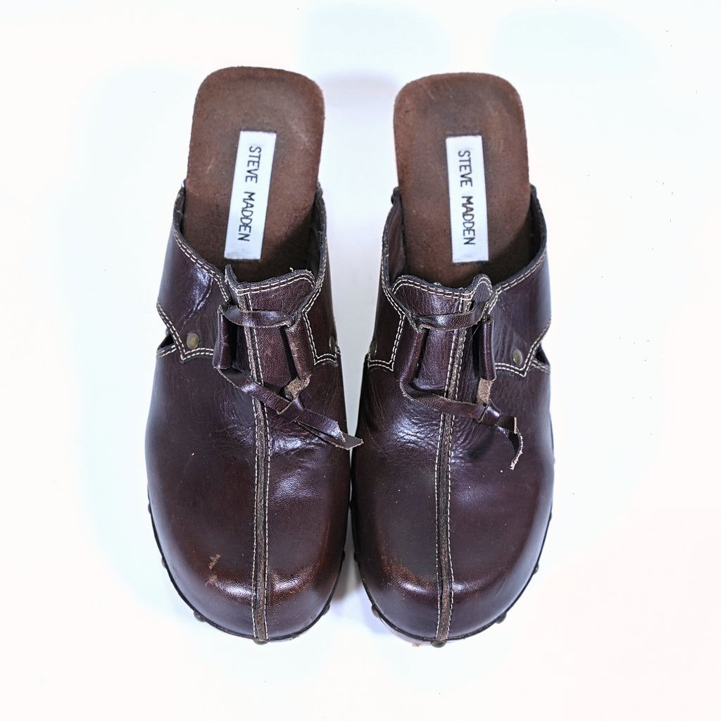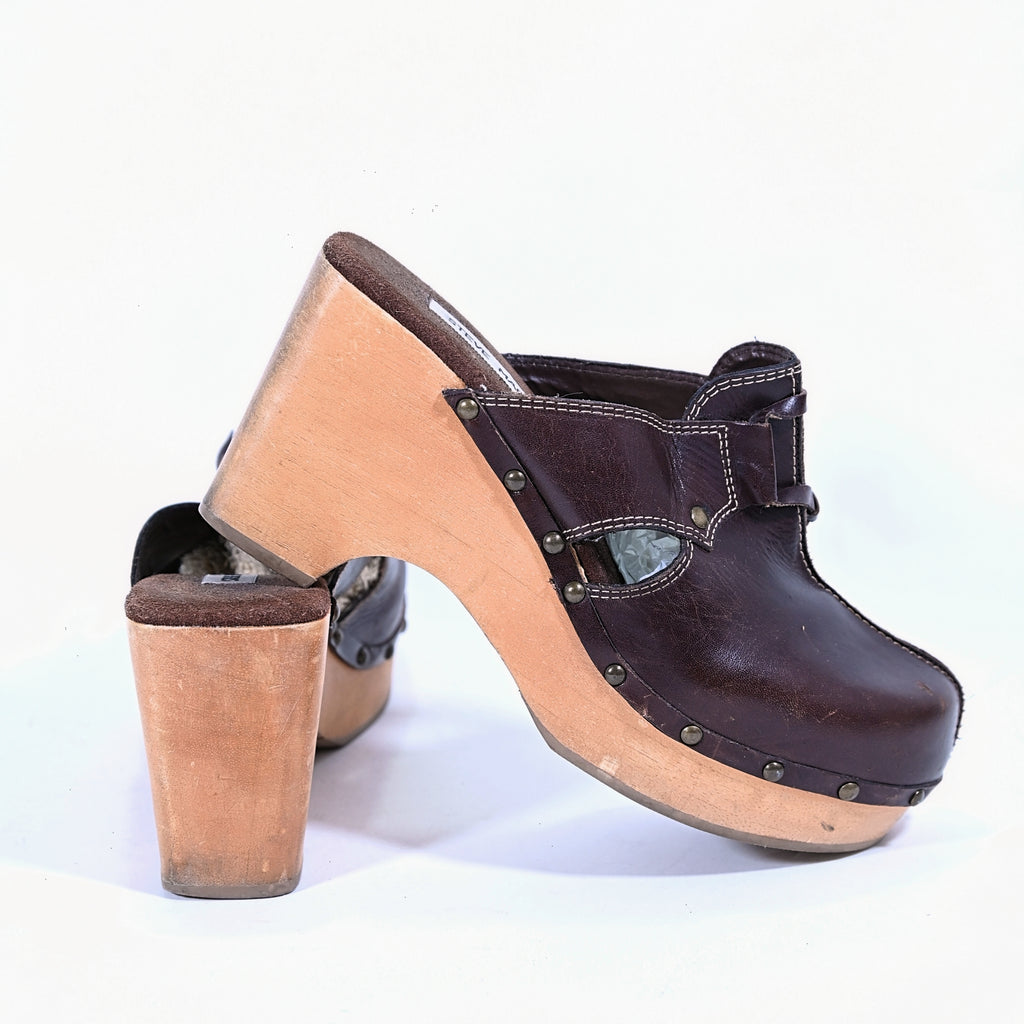 Vintage 90s wooden platform clogs, leather upper with studded accents.