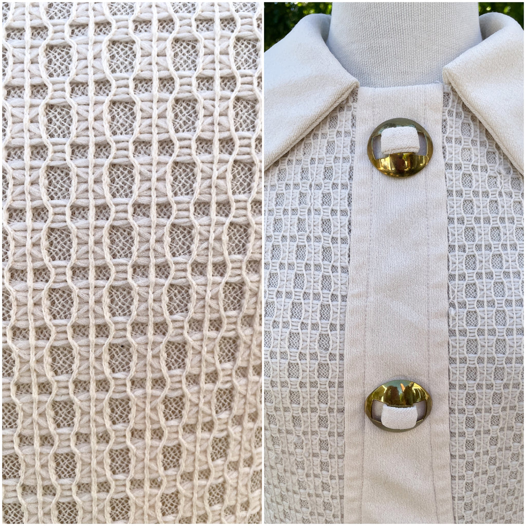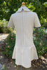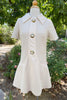 1960s dropped waist flare skirt mini dress with large collar and brass details.
