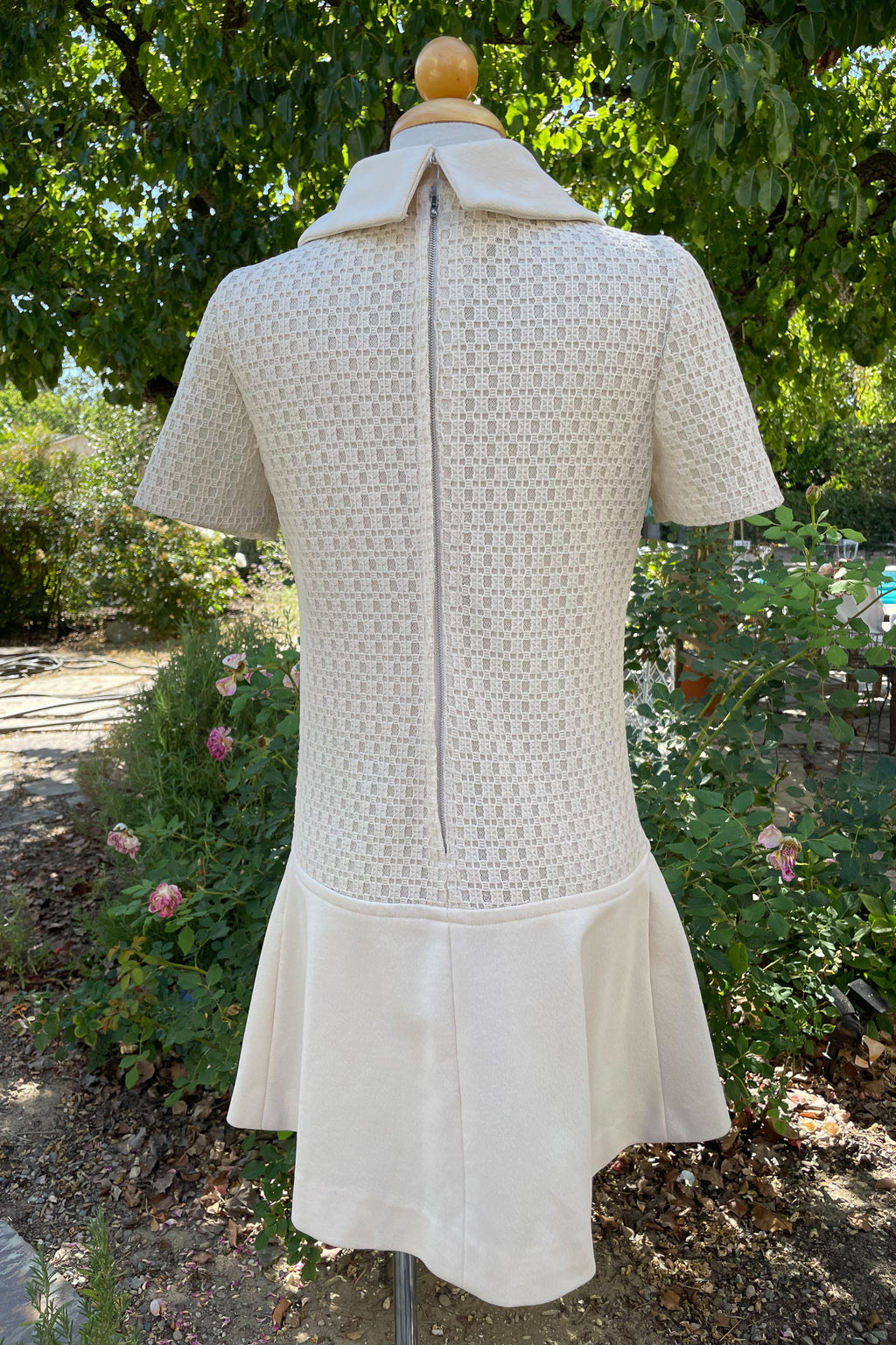 Short sleeves, metal zipper up the back. The skirt flares just below the hipline.