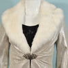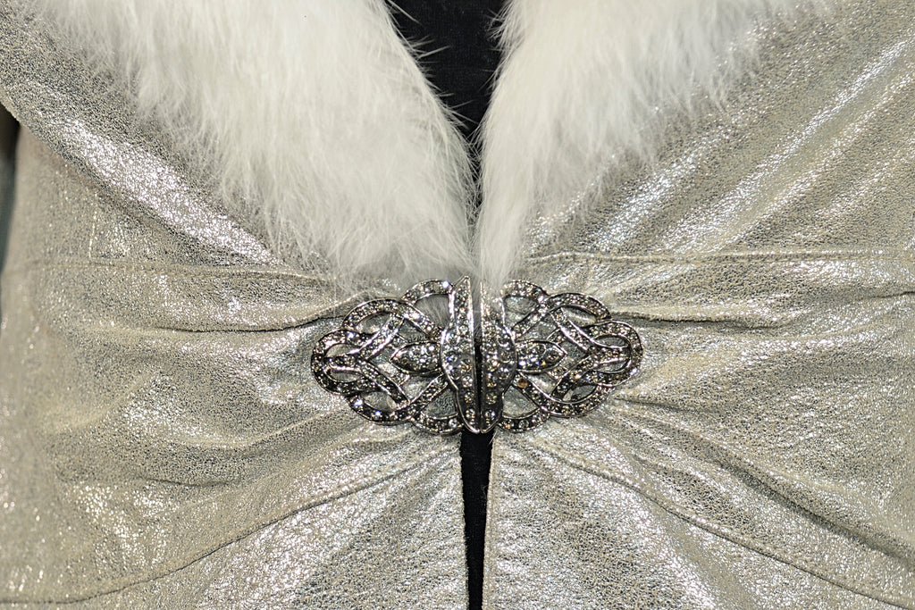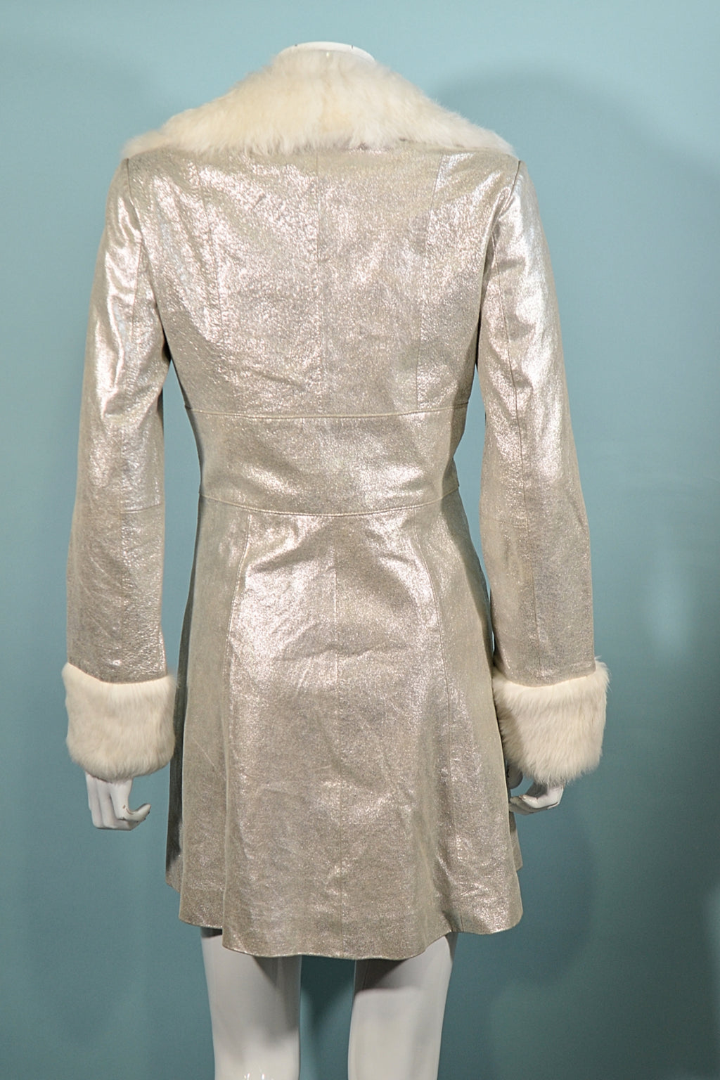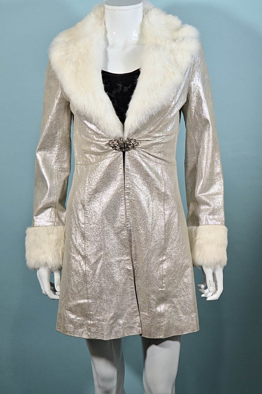 Beautiful metallic silver leather coat with rabbit fur collar & cuffs.