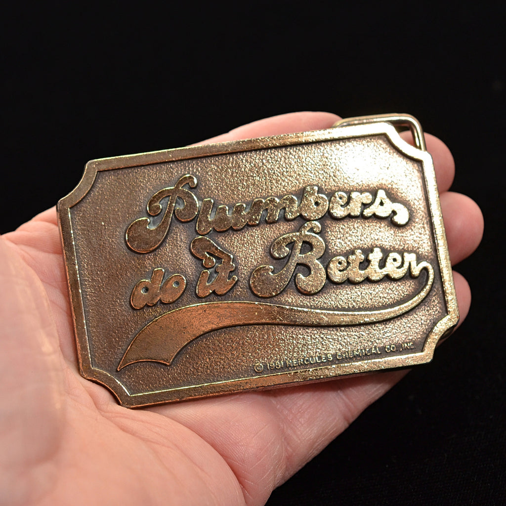 Vintage 80s "Plumbers Do It Best" brass belt buckle.
