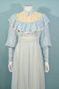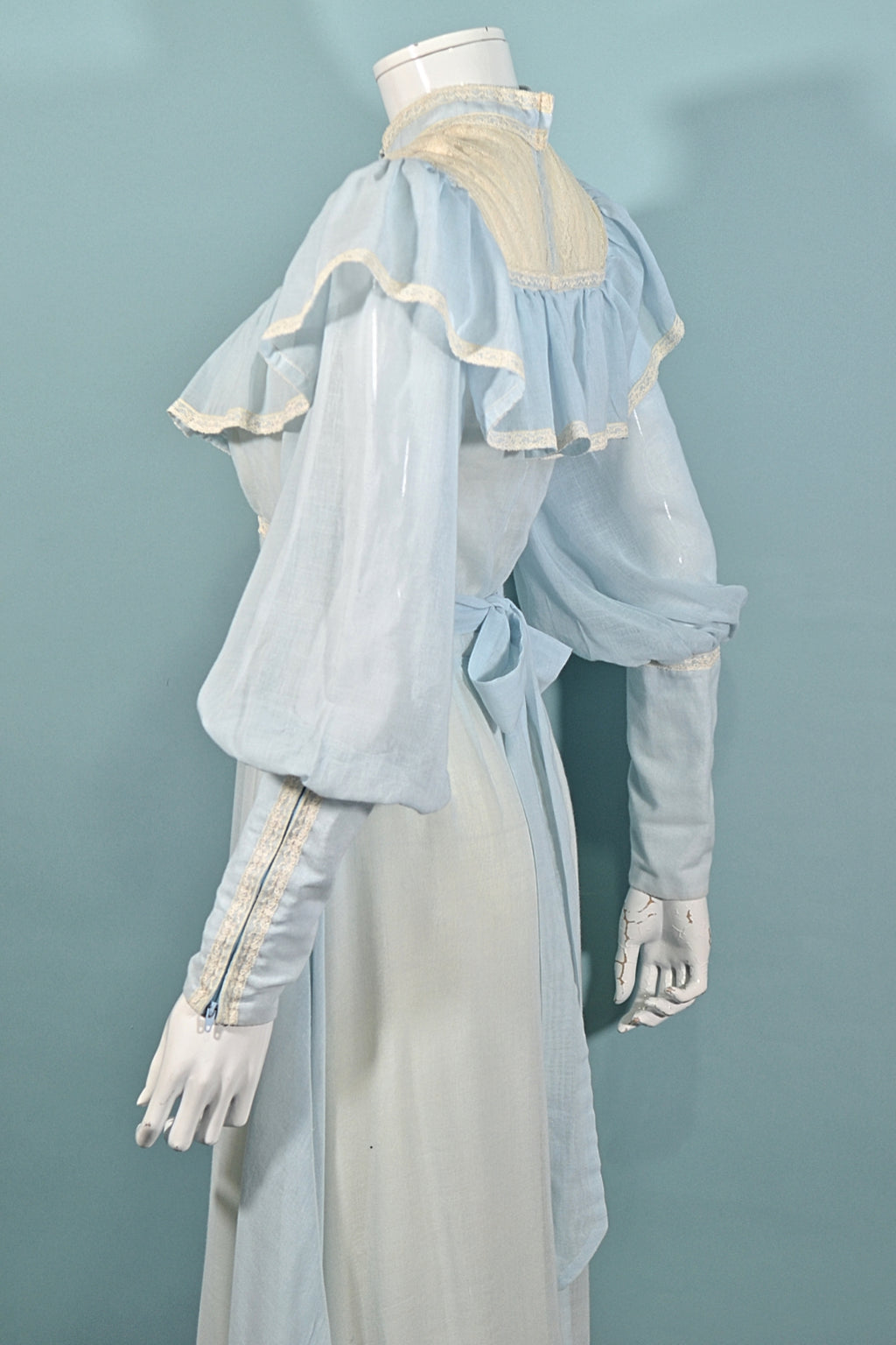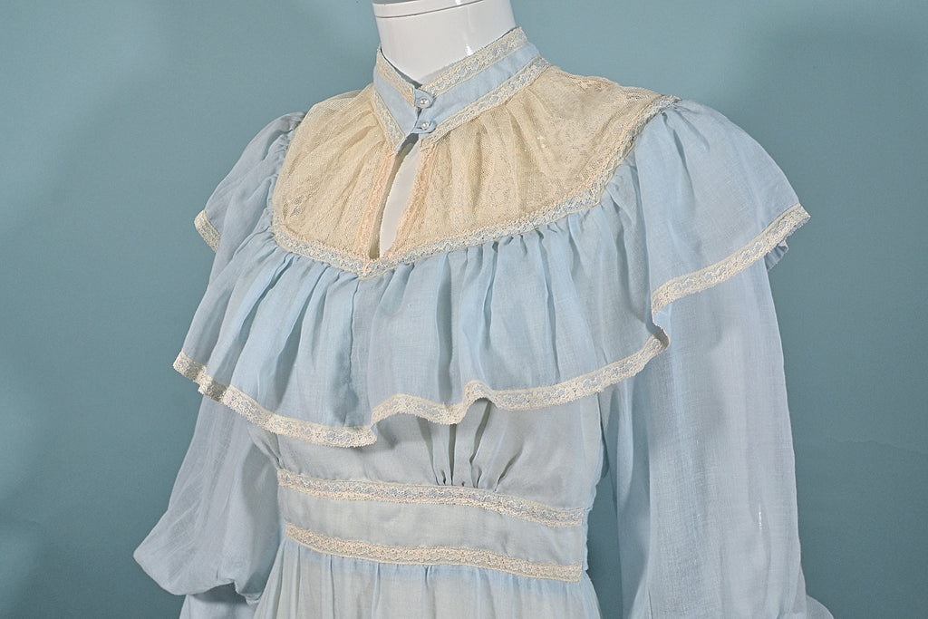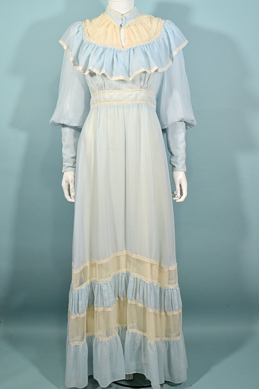 Vintage Gunne Sax baby blue maxi dress with a high neck & ruffle neckline.