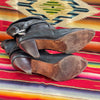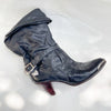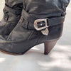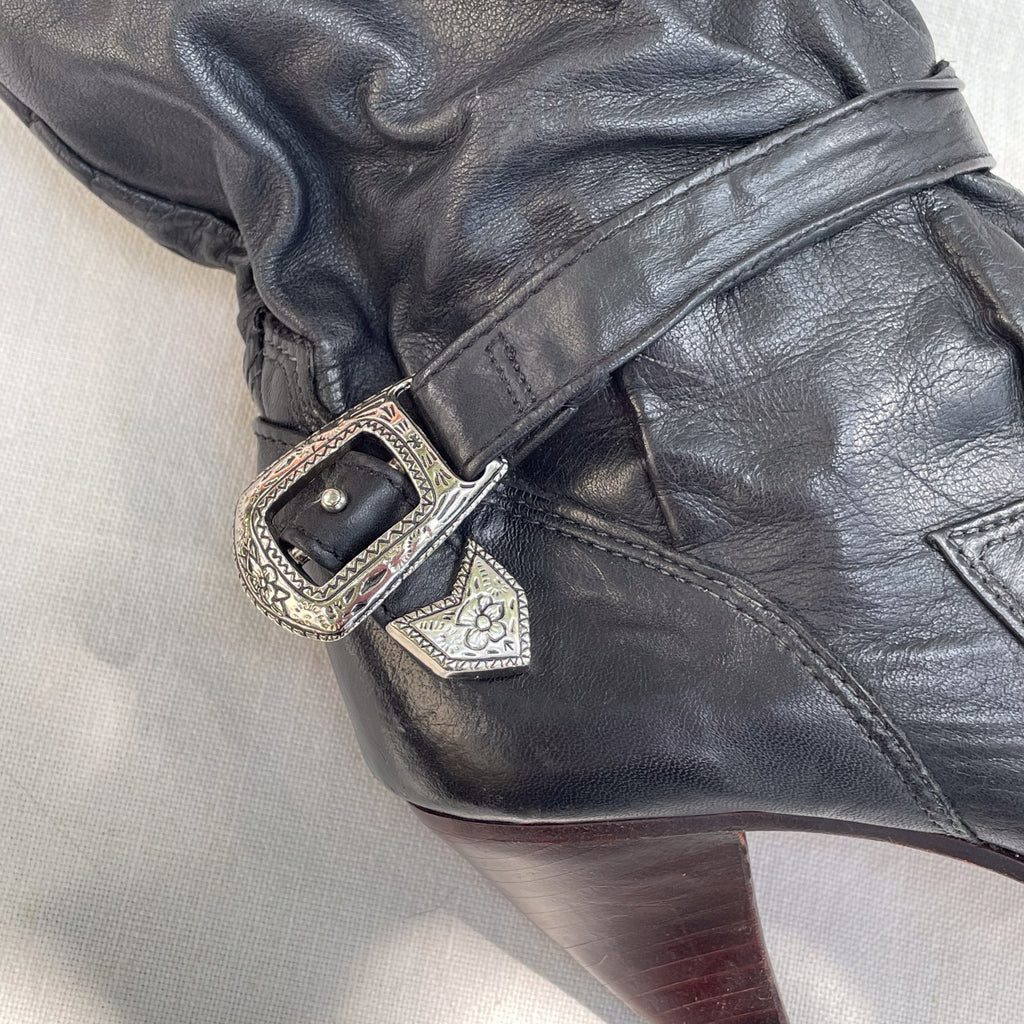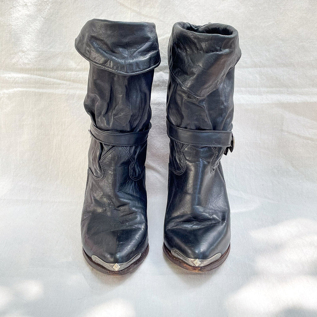 Slouchy style, ankle straps with a buckle, metal toe caps.