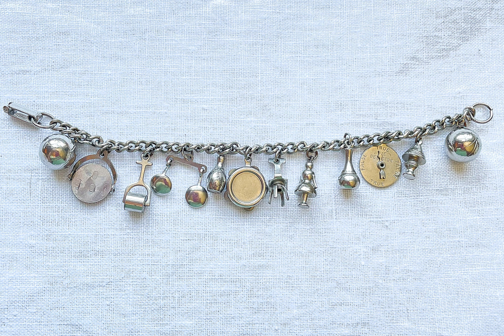 SOLD Vintage Silver Tone Charm Bracelet, MCM Costume Jewelry Bracelet, 12 Charms