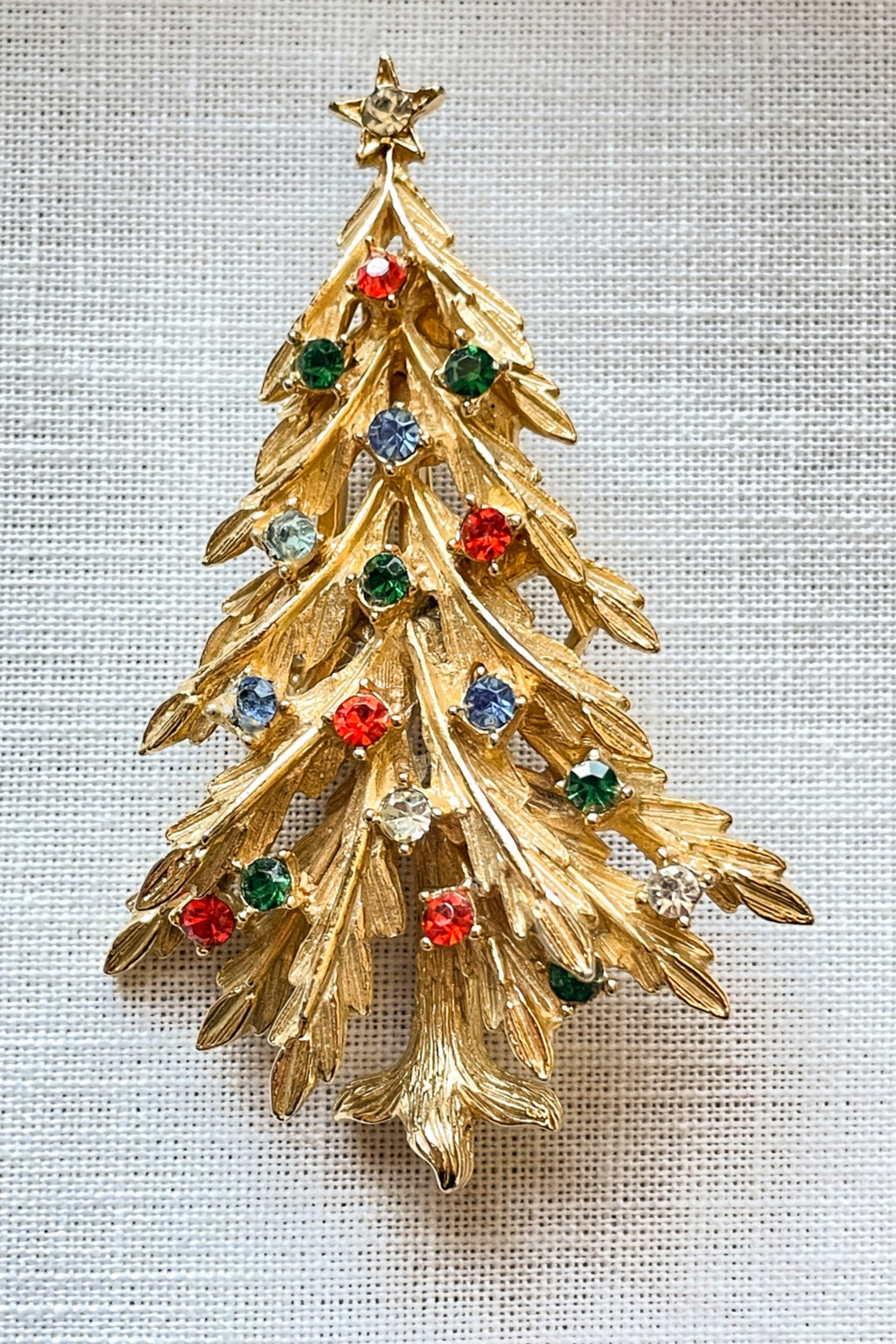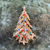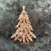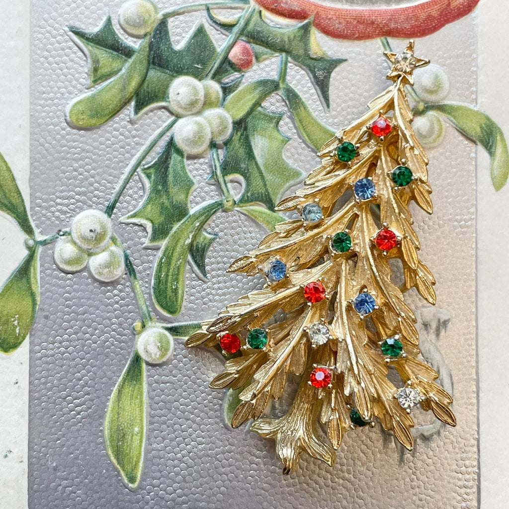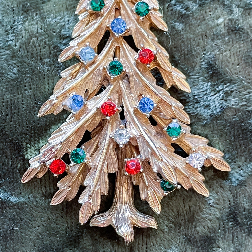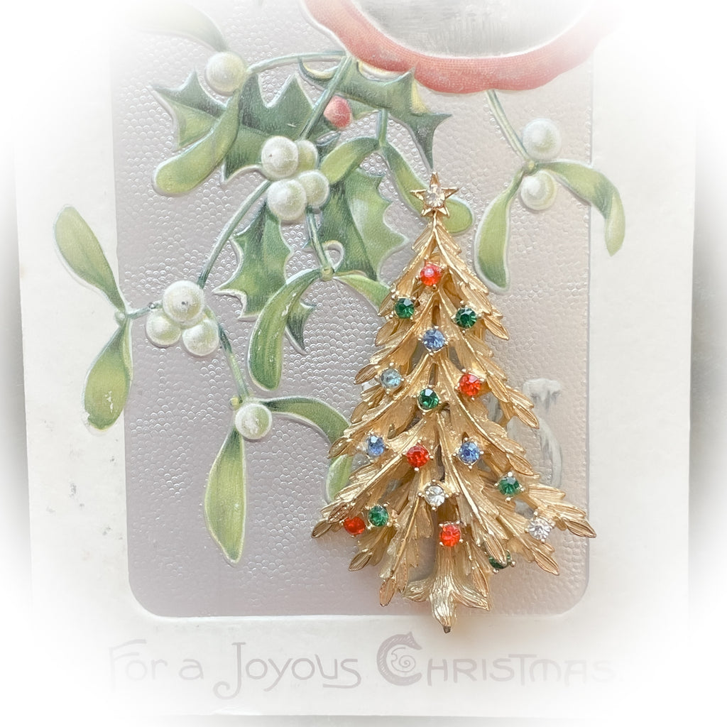 Vintage MCM gold tone Christmas tree brooch with colored rhinestone accents.