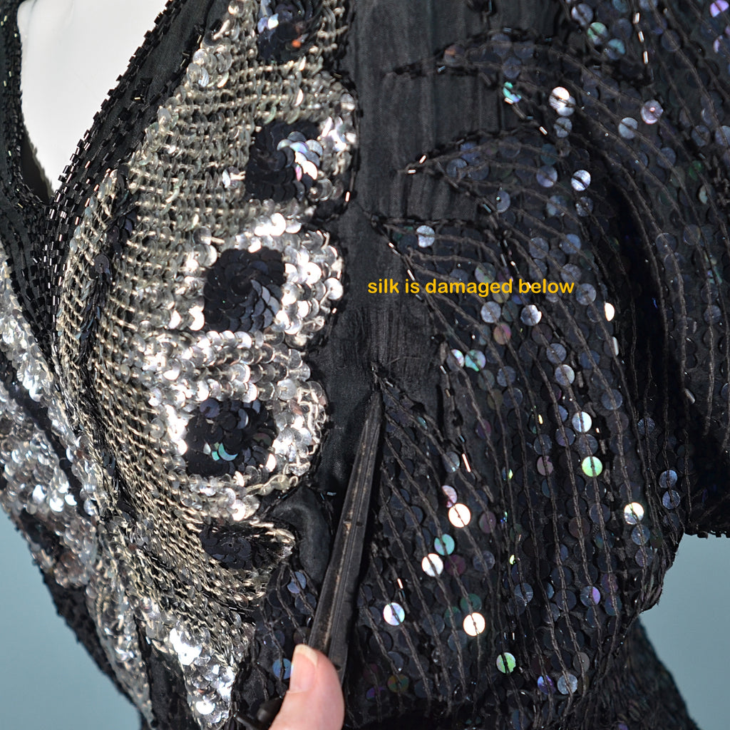 CONDITION: Good. Small repair on the front, really hard to see. Some loss of sequins and loose threads. Not perfect but good to wear as a costume or for study.
